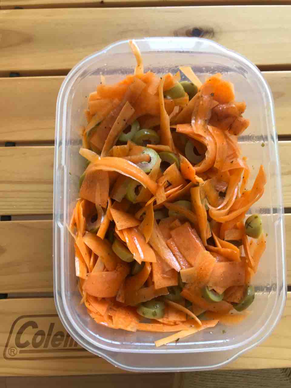 にんじんはピーラーで薄くむいて、塩・胡椒・オリーブオイル・酢でマリネし、成城石井のオリーブ漬けと合わせました。