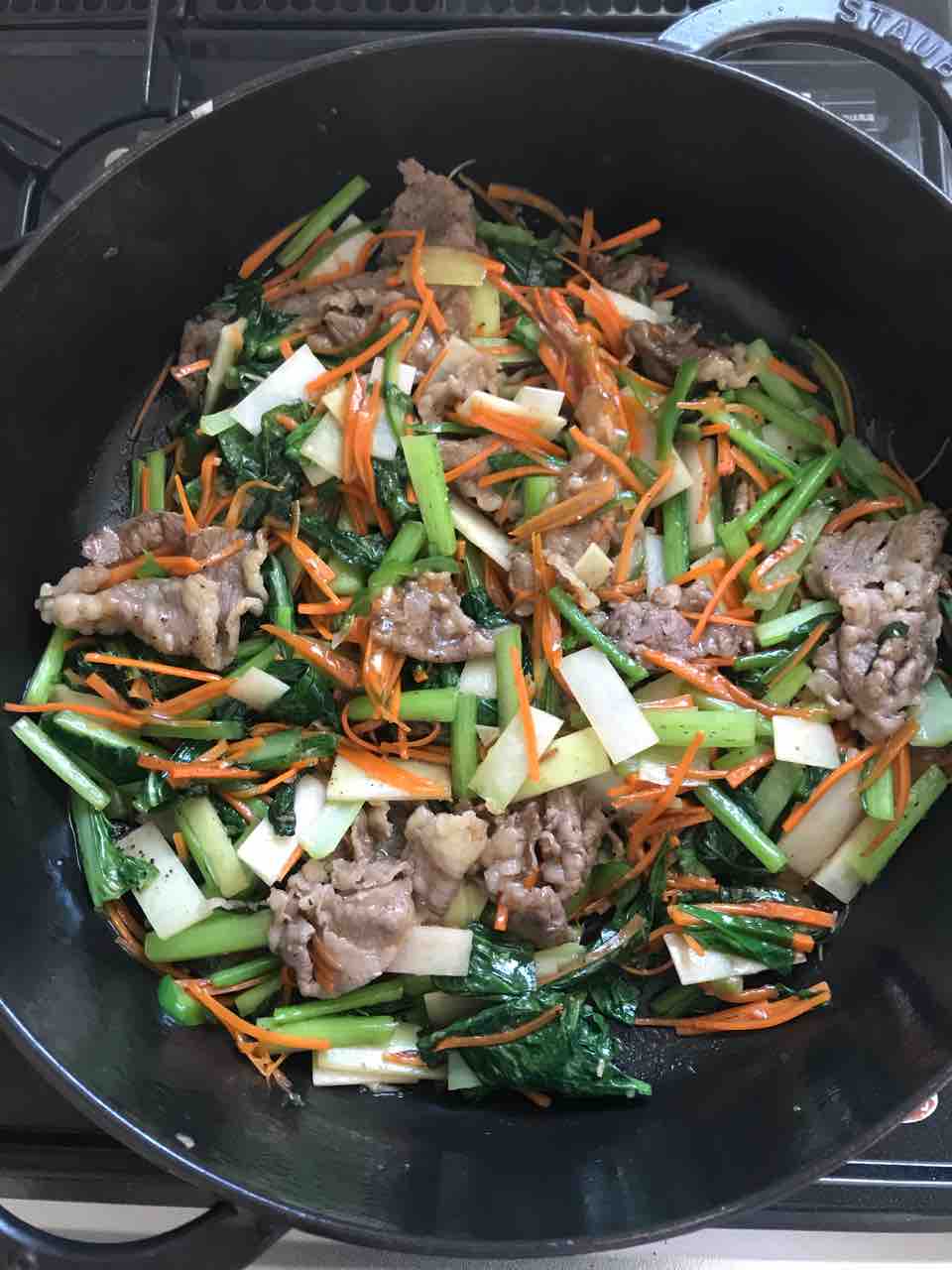 牛肉、小松菜、大根の皮、にんじん、ピーマン、生姜、にんにく で肉野菜炒めも作りました。