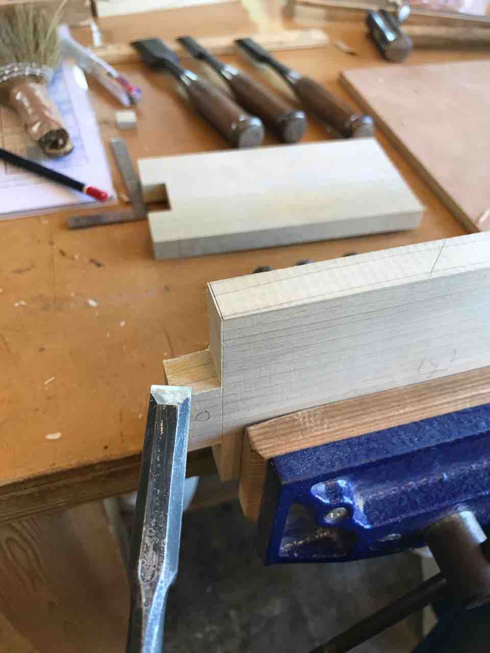 三枚組継の女木(凹部材)の仕上げを鑿を使ってやりました。