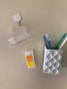 ウチには、独立した洗面所がありません。お風呂の中に鏡と洗面台があるのですが、シャワーで水浸しになるので、ハミガキ道具を置くのはやめてます。