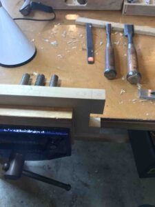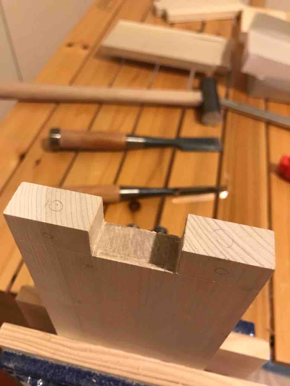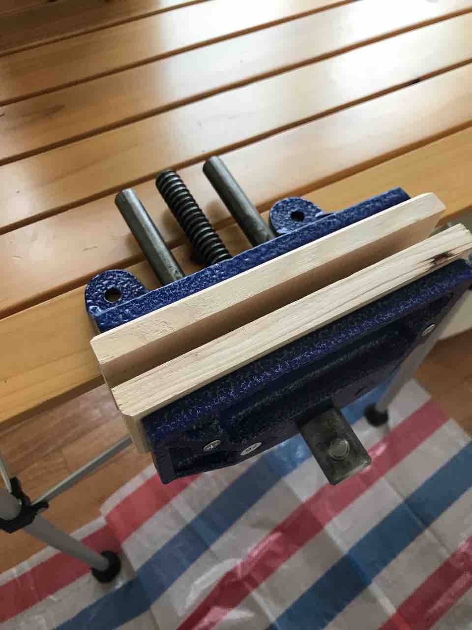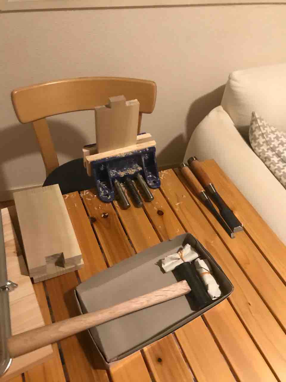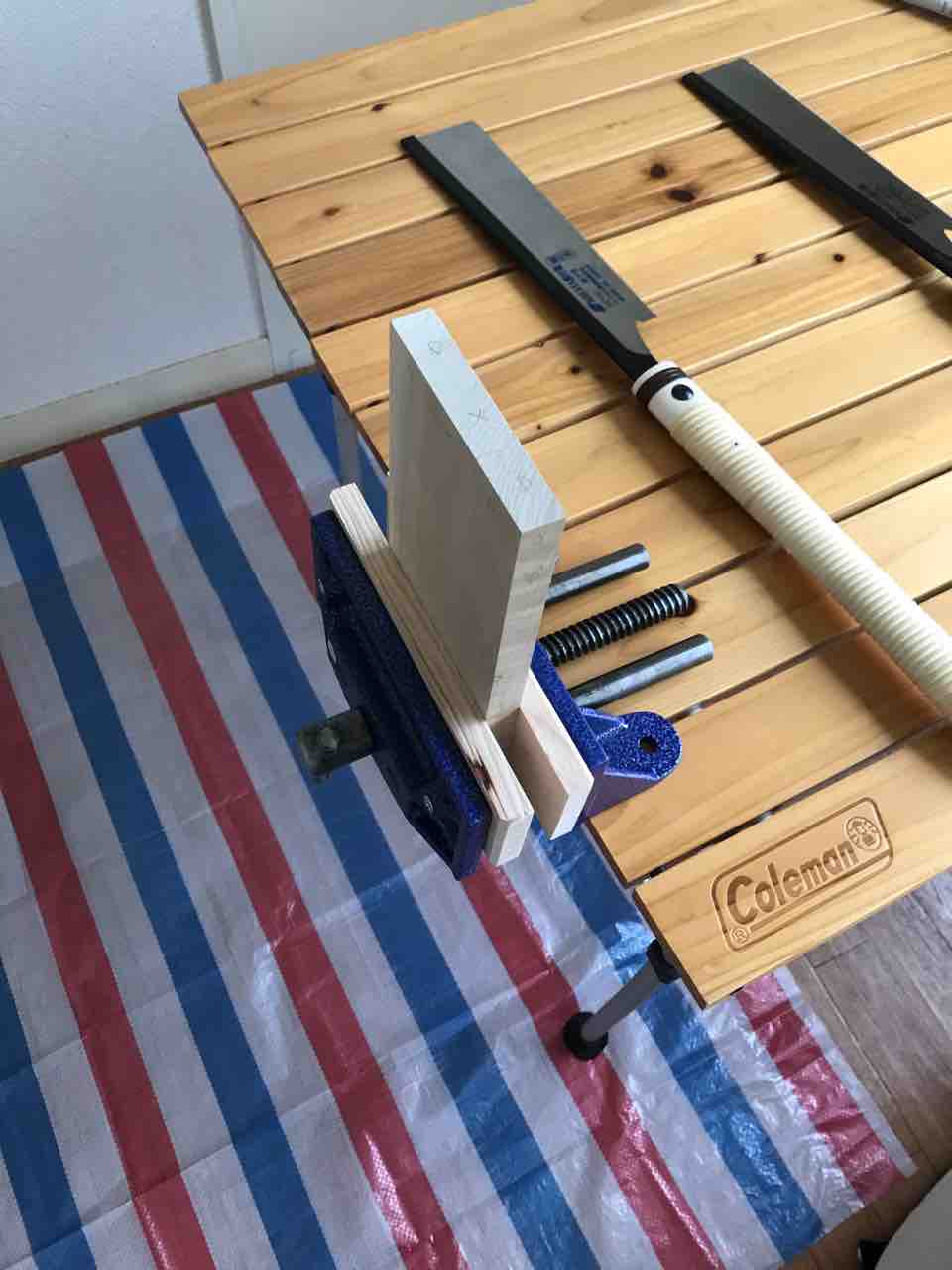 自宅の木工環境 2018 10/02 木工教室 2018年10月2日 木工教室で取り組んでいる、枡作りを家でも進めるために、ちいさな環境を整えました。 と言っても、テーブルの一角にバイスを付けただけなんですが。ちなみに、バイスは簡単に外せます。 細工用の鋸も買いました。胴付き(横引き)と縦引き各1本です。 レジャーシートを敷いて、切子を受ければ、お掃除もラクラク? 早速、鋸、鑿(のみ)、玄能で、加工も進めることができました。 家でもできるだなんて、すごくうれしいですが、ちょっとごちゃごちゃしてしまいました。 日常の細切れ時間で、さっと作業して、パッと片付けられるような仕組みを整えるつもりです。 今後必要なのは、切子を払うブラシと、お道具の収納箱です。 楽しく整えていきたいと思います。 励みになります。 応援のクリックお願いします<(_ _)> 木工教室 この記事が気に入ったら フォローしてね! Follow @citrus_bkr よかったらシェアしてね! URLをコピーしました! URLをコピーしました! My鑿(のみ)の仕込み 枡作り その6 この記事を書いた人 kitchen_obake 関連記事 【木工教室 最終回】白書き(しらがき)と毛引き(けひき)の仕込み 2021年8月30日 小抽き出し その27 塗装(2回目), 持ち手の取付け 2021年8月29日 小抽き出し その26 台輪の取付け、塗装(1回目) 2021年8月26日 小抽き出し その25 抽き出しのはめ合い調整 2021年8月19日 小抽き出し その24 天板の取付けと台輪 2021年7月23日 小抽き出し その23 背板の接ぎ合わせ 2021年6月24日 小抽き出し その22 天板の接ぎ合わせ 2021年6月11日 小抽き出し その21 摺り桟の取り付け 2021年6月10日 コメント コメントする コメントをキャンセルコメント ※ 名前 ※ メール ※ サイト 次回のコメントで使用するためブラウザーに自分の名前、メールアドレス、サイトを保存する。