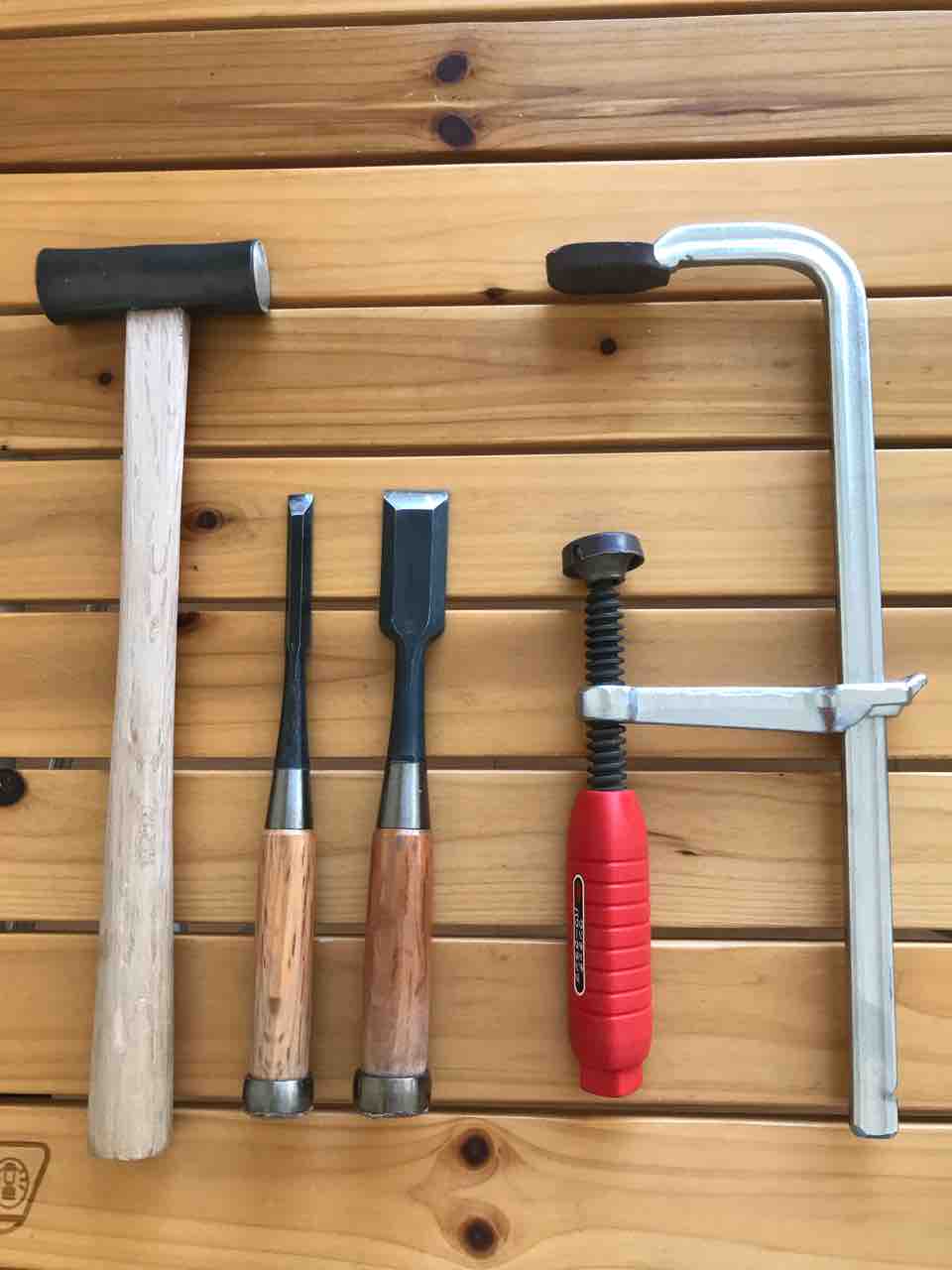 主に、ほぞ組みなどの穴掘り作業に使います。玄能で叩いても木の柄が壊れないように、端に金属製の輪「かつら」が付いてます。私は、三分(約9mm)と八分(約24mm)の鑿を使っています。