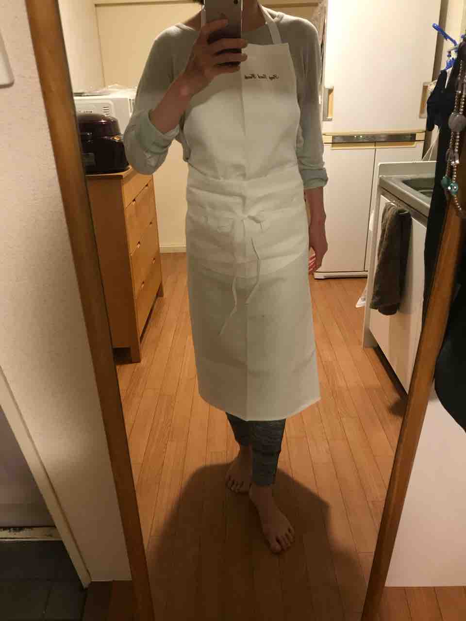 帰宅して装着してみました。まさに理想のエプロンでした。ヒモが腰の高さでキリッと結べるところが、職場のサロンぽくてなじみます。