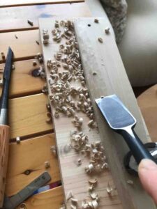 鑿(のみ)のしのぎ面を木に沿わせながらえぐるように削っていったのですが、スイスイと削れるため、すごく楽しかったです。