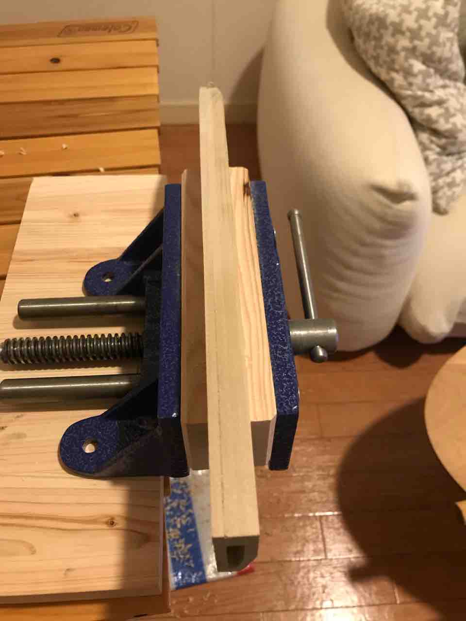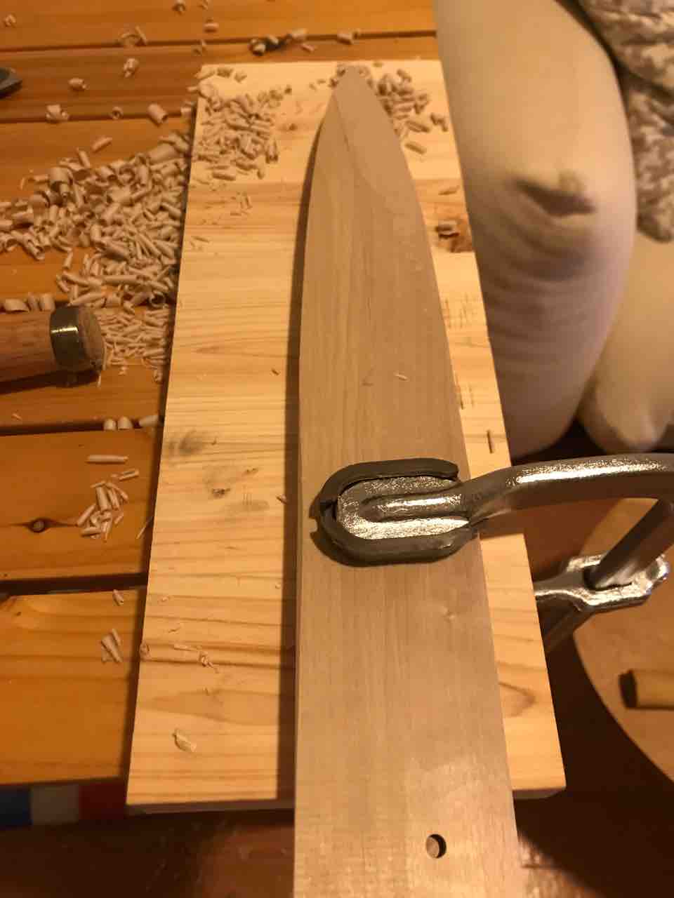 しのぎ筋をシャープペンシルで下書きしてから、鞘をF型クランプで固定して、八分の鑿(のみ)で削っていきました。