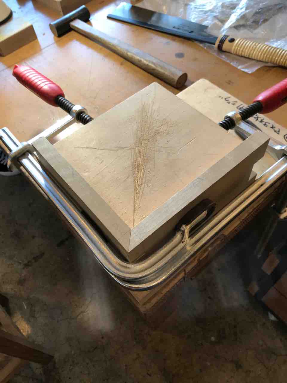 まずは、専用の治具を使い、鑿(のみ)で削る方法です。