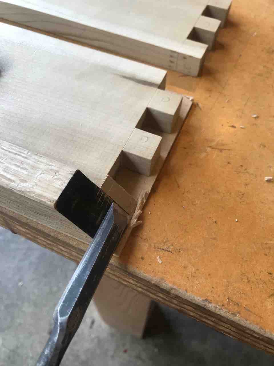 正確に45℃に加工された治具に留部分をそわせて、鑿で削りました。