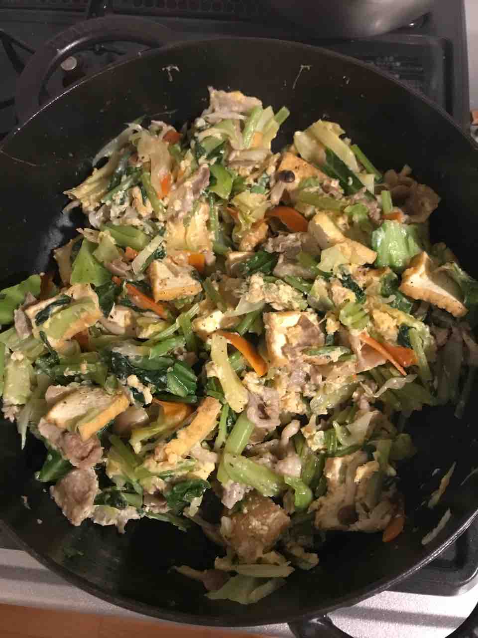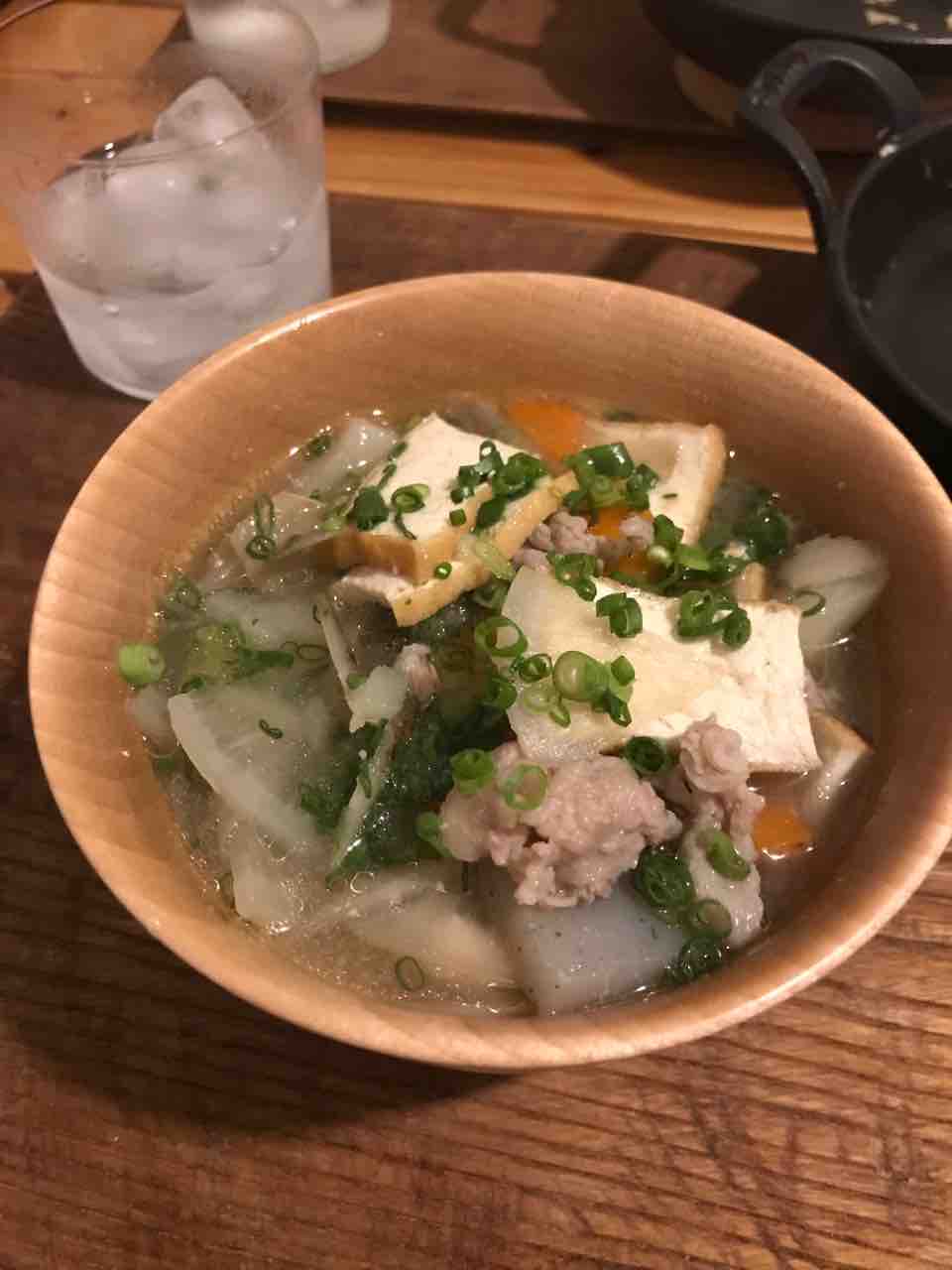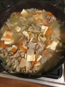 豚肉、大根、ごぼう、じゃがいも、こんにゃく、厚揚げ で豚汁を作りました。包丁、火入れ、味つけはほとんど息子がやってくれました。私は出汁を引いてごぼうをささがきしただけです。