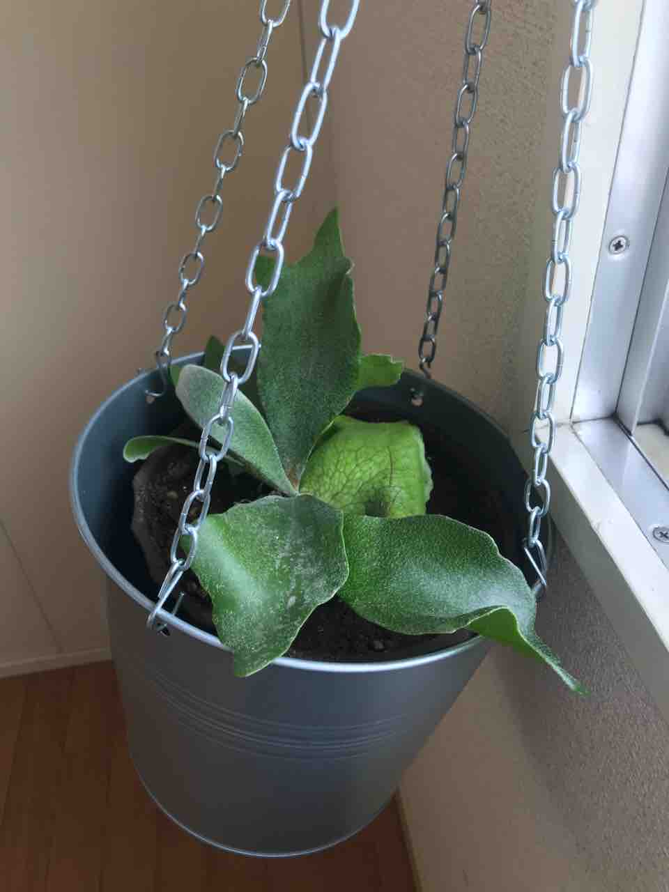 コウモリランが少しずつ大きくなってきたので、植え替えを兼ねて、ハンギングプランターで吊るすことにしました。