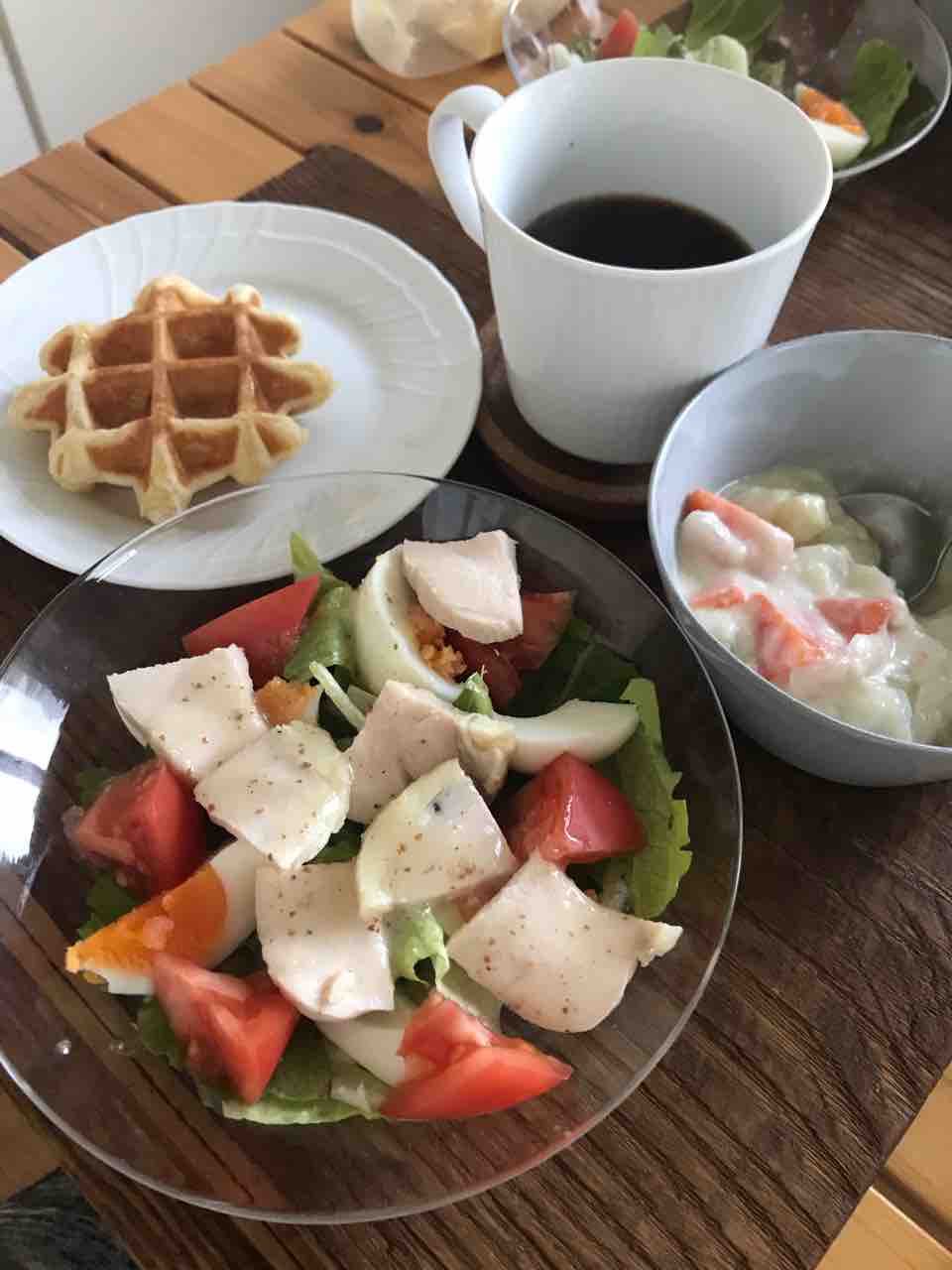 息子と2人の朝食で、焼きたてを食べました。鶏ハムとゆで卵のサラダ、チキンフリカッセ、ケニアコーヒー とともに食べました。すごくおいしかったです。