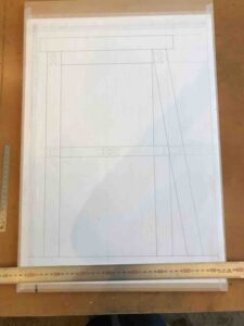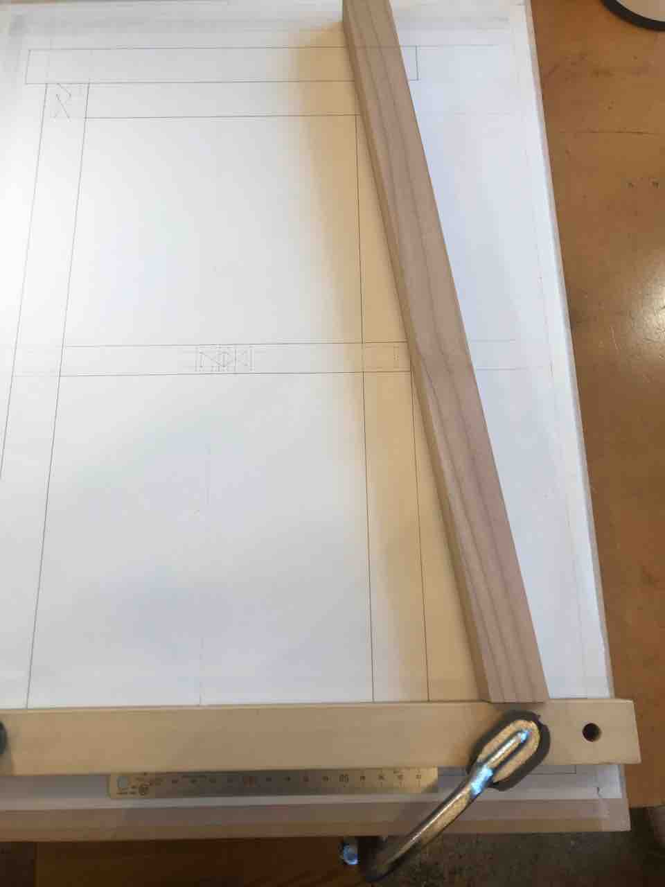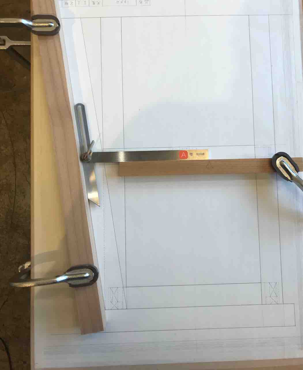 一歩前に出た脚の加工をするために、図面に自由定規を当てて、斜めの角度を作りました。