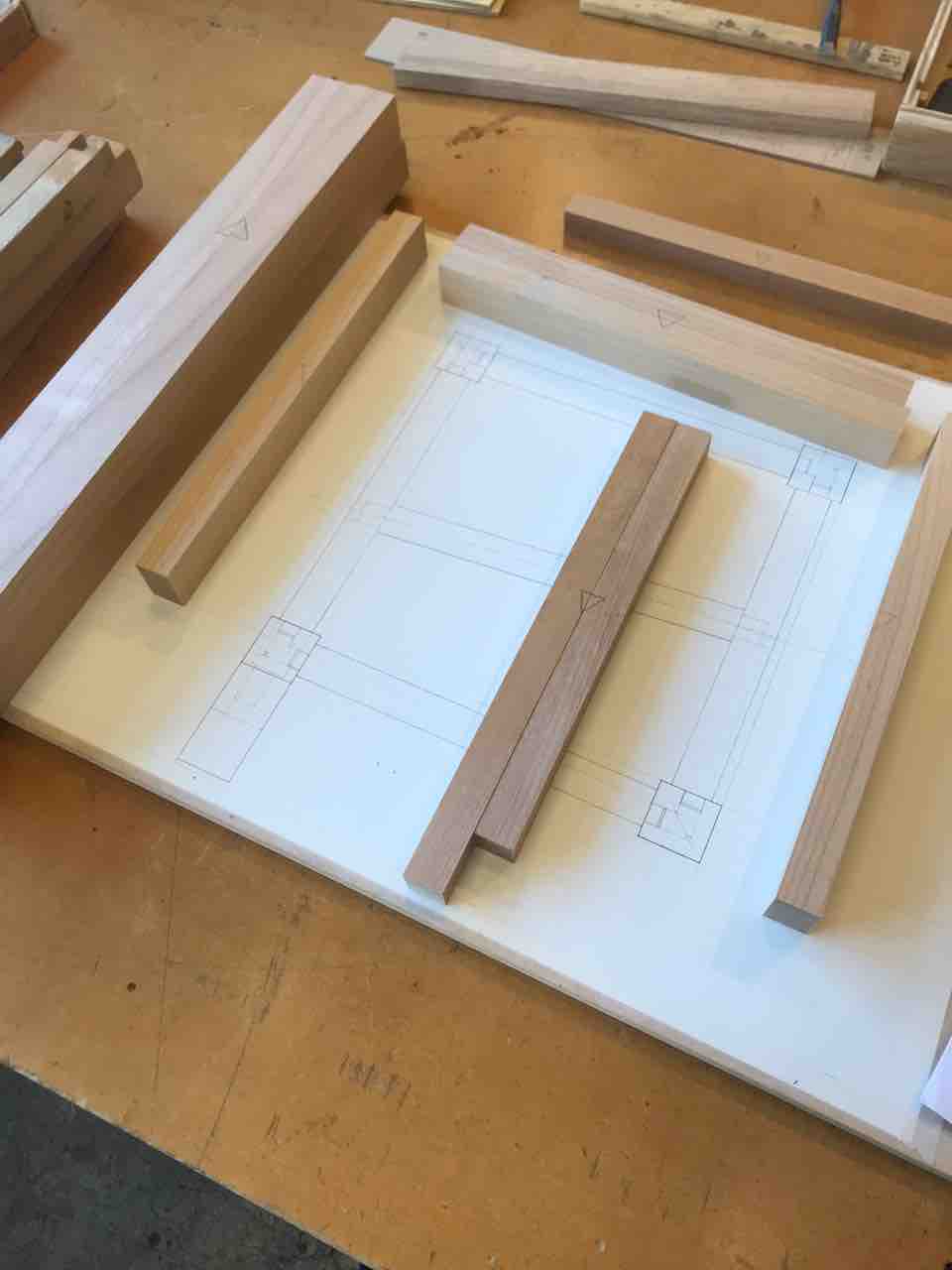 それで、材料を見ながら、向きを決めました。正面や裏表が一目でわかるような印(勝手墨と言います)を決めて記入しました。