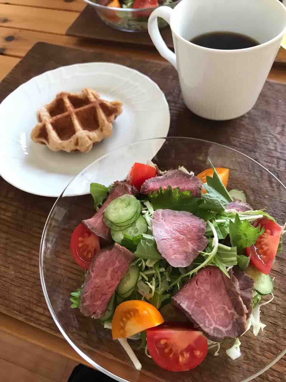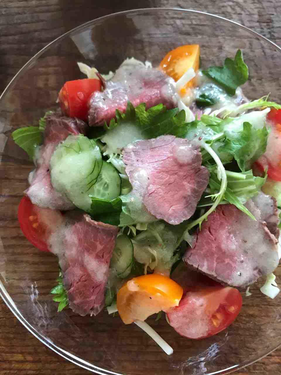 そのローストビーフと、キャベツ、水菜、きゅうり、大葉、トマト でサラダを作りました。