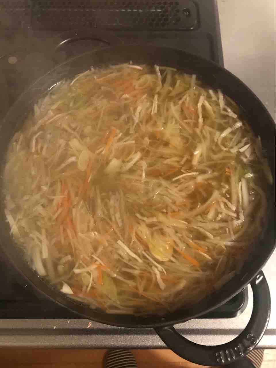 大根、にんじん、れんこん、エリンギ、白菜、長ねぎ、豚バラ肉 で沢煮椀を作りました。味付けは薄口醤油とゲランド塩のみなのに、すごくおいしかったです。