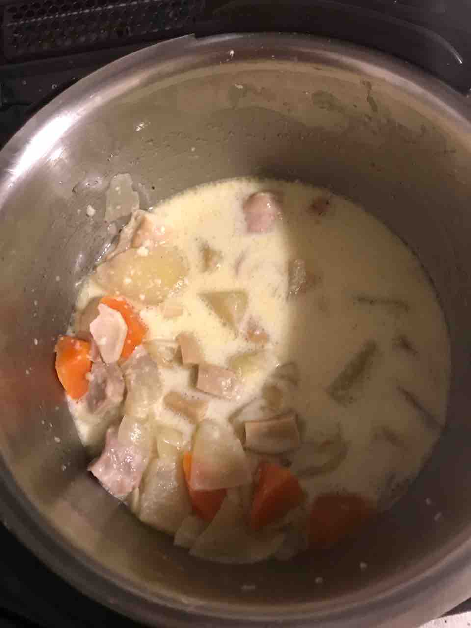チキンフリカッセは電気IH圧力なべ で予約調理しました。外出して帰宅したら火入れが終わっていたので、ホワイトソースを作って仕上げました。本当に楽ちんなんです。
