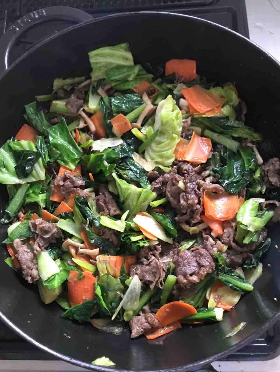 牛肉、キャベツ、小松菜、葉ねぎ、にんじん、しめじ で肉野菜炒めを作りました。花椒油を使い、仕上げには花椒を挽き入れました。すごくおいしかったです。