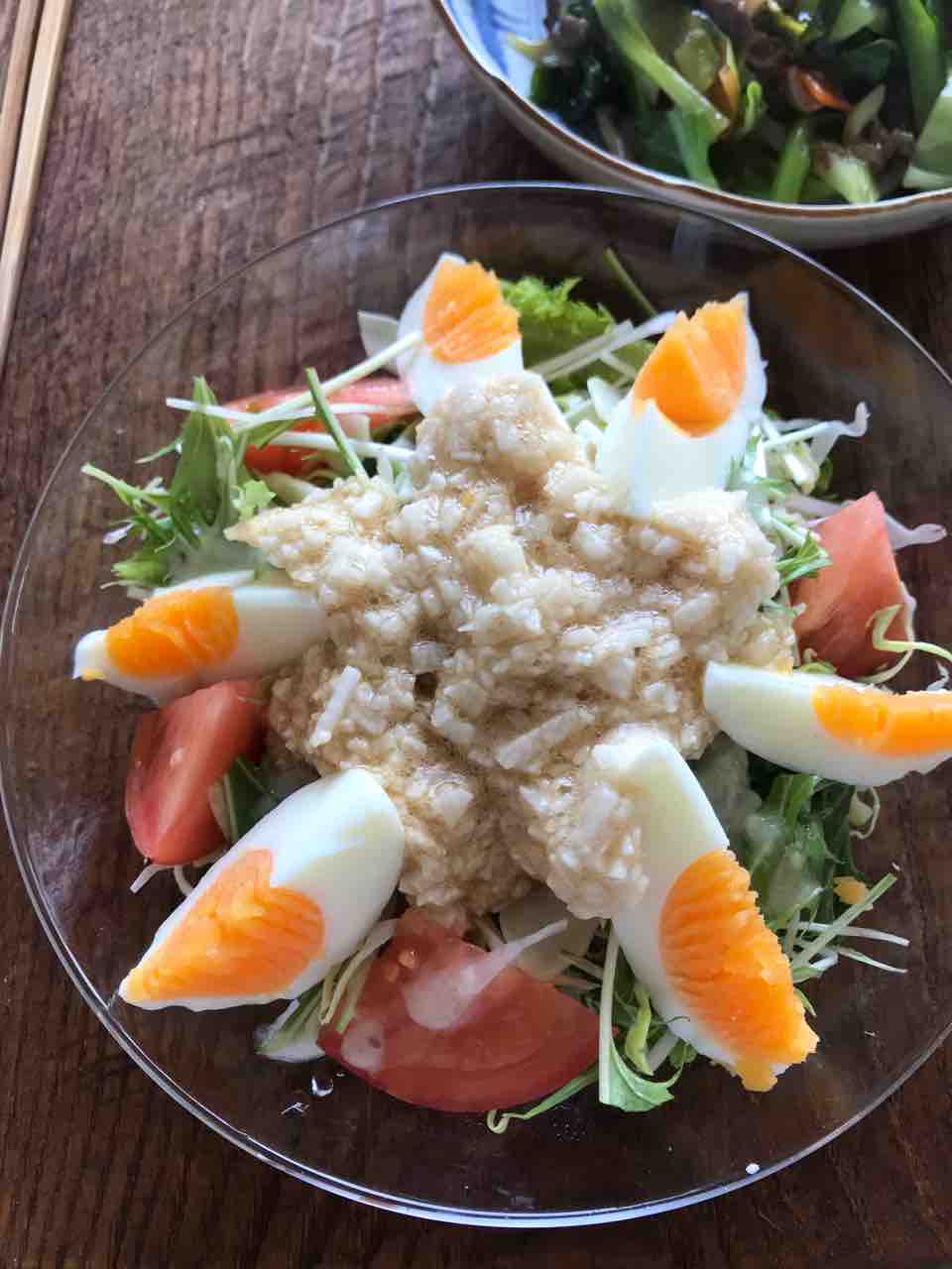 千切りキャベツ、水菜、叩き長芋、トマト、ゆで卵 でサラダも作りました。