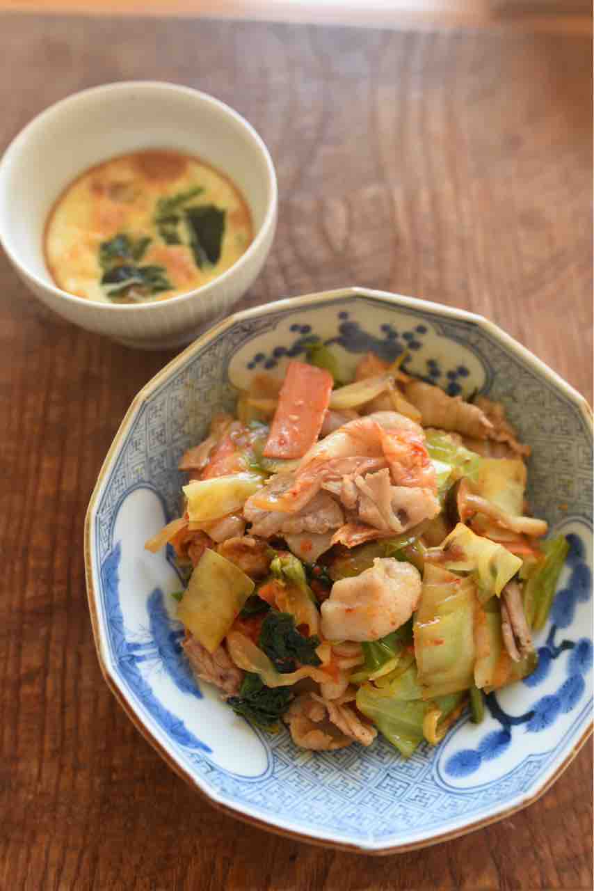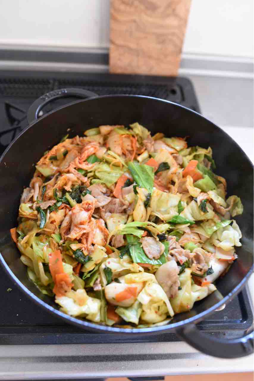豚ばら肉、キムチ、春菊、キャベツ、にんじん でキムチ炒めも作りました。
