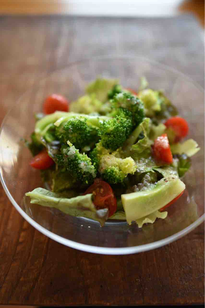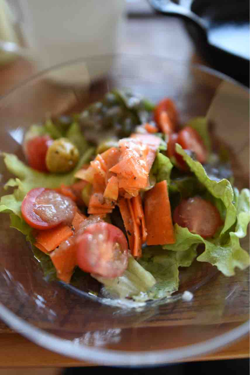 サニーレタス、ミニトマト、にんじんとオリーブのマリネ、それに手作りドレッシングをたっぷりかけました。