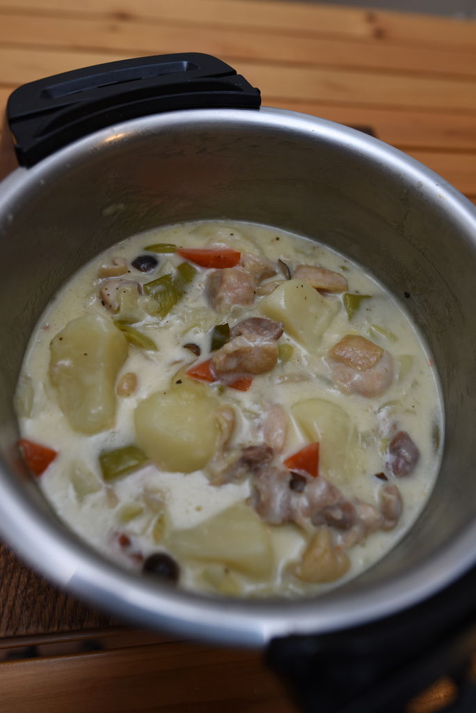 鶏もも肉、玉ねぎ、にんじん、しめじ、モロッコインゲン、生クリーム でチキンフリカッセも作りました。