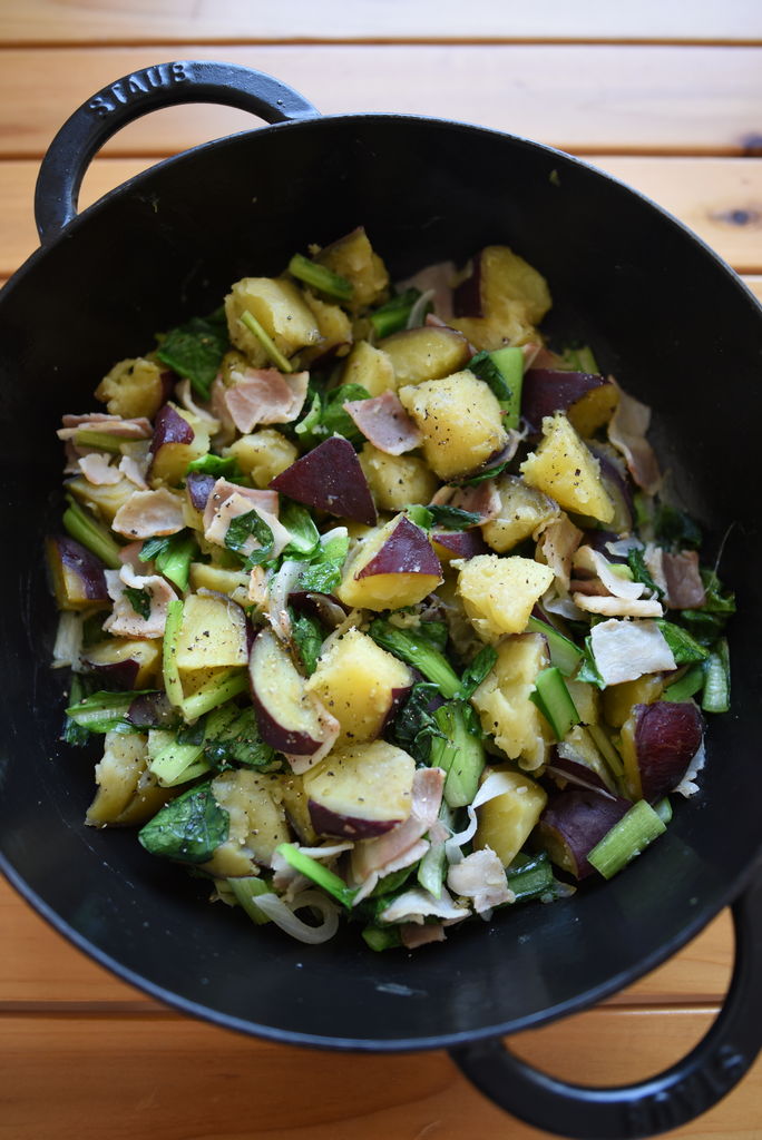 ベーコン、新玉ねぎ、小松菜、さつまいも で炒め物も作りました。
