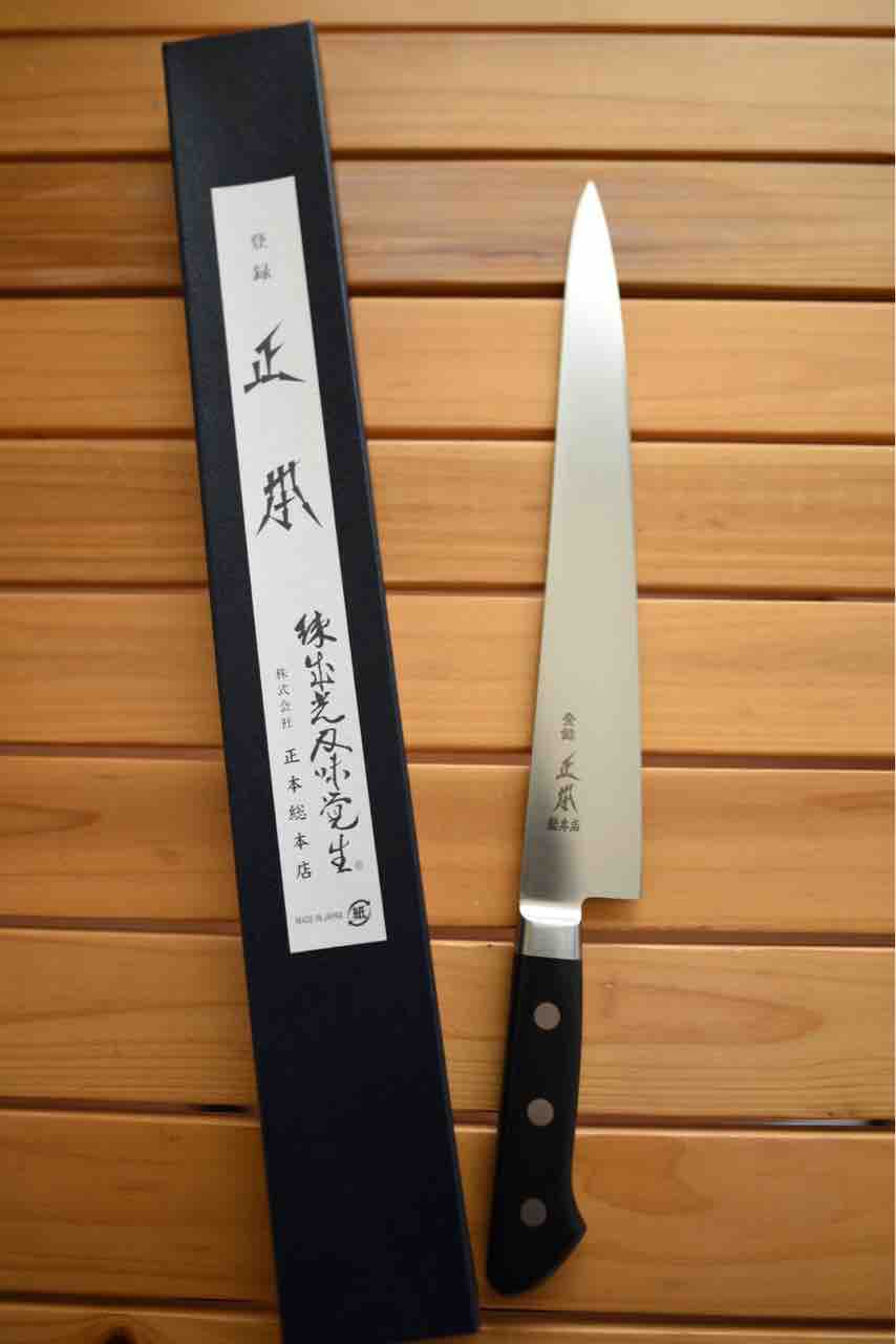 何キロもあるブロック肉の筋引きやスライスをするのに、最初は27cmの牛刀を使っていたのですが、もっと細身で小回りのきく包丁が欲しくなりました。