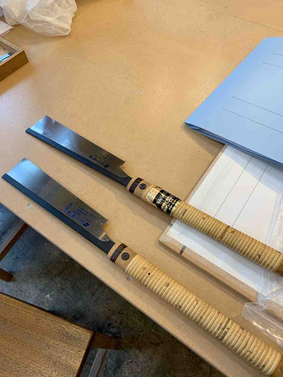 鋸は、胴付(どうつき、木の繊維の断面方向のこと)と縦引きを使い分けます。