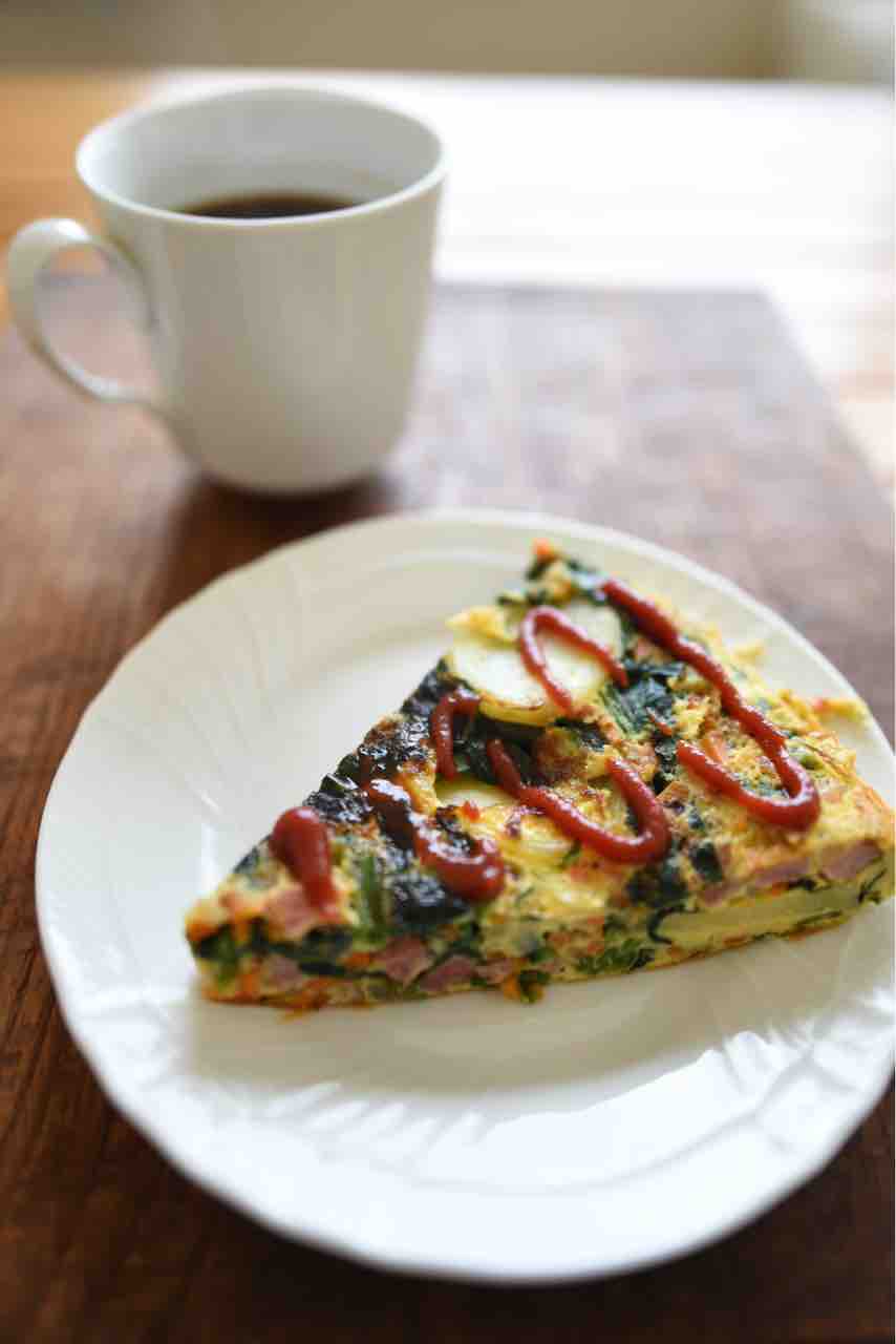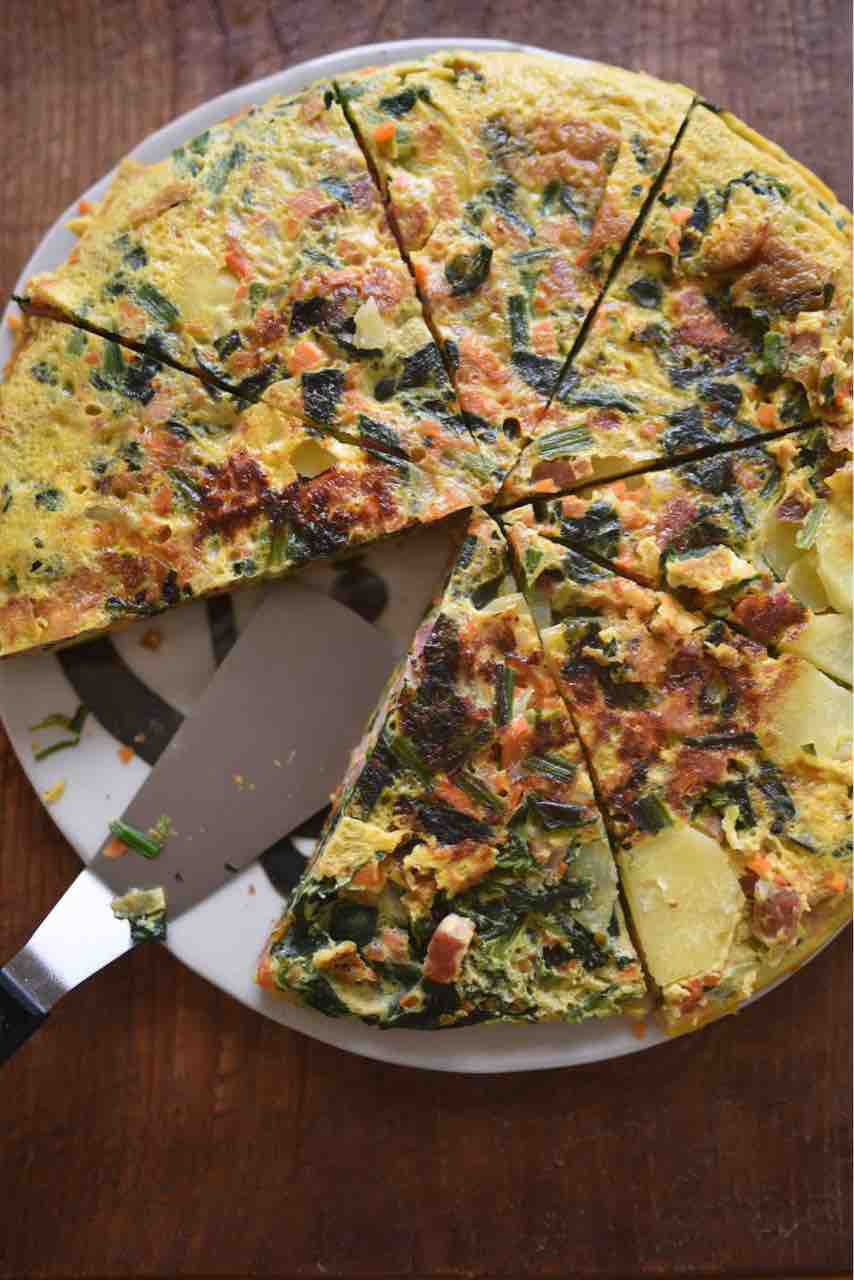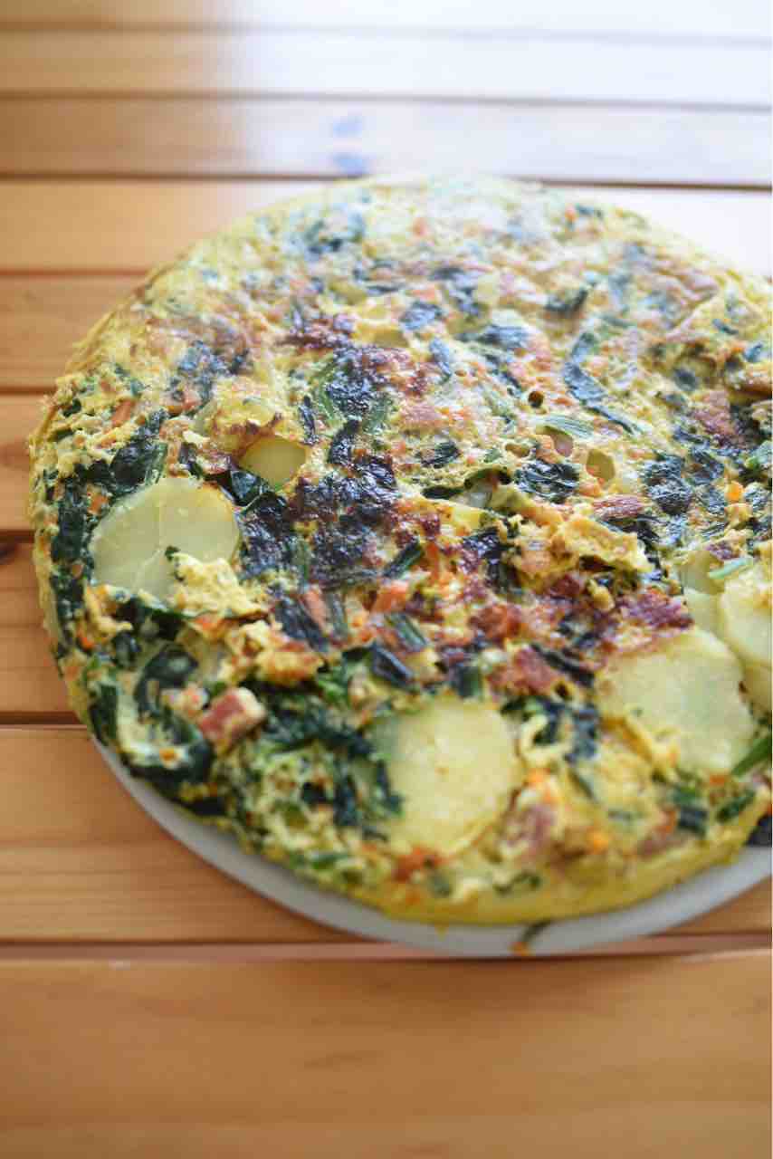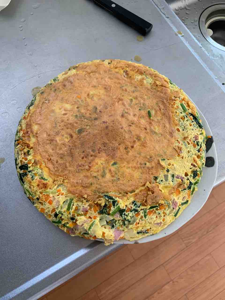 もう一度、お皿をかぶせてひっくり返して取り出すとできあがりました。野菜やじゃがいもがたくさん入って、もろくこわれやすい大きなスペイン風オムレツも、ご覧のとおりきれいに仕上げることができました。