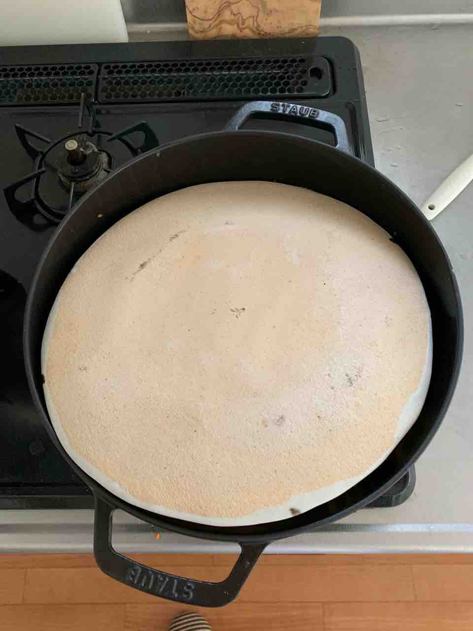 そしてこれをそのままソテーパンにずらしながら戻し入れます。こうすると裏面も焼くことができます。