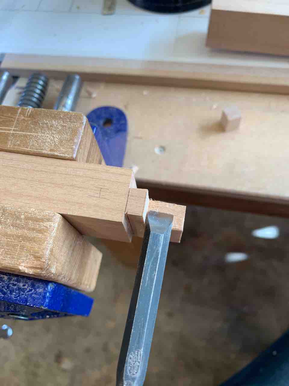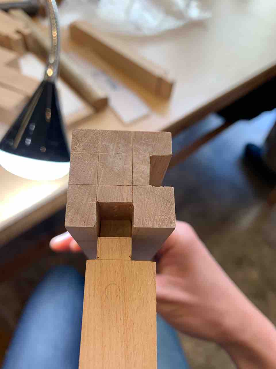 そして、脚のホゾ穴にはまるよう、鑿で削りながら調整していきました。