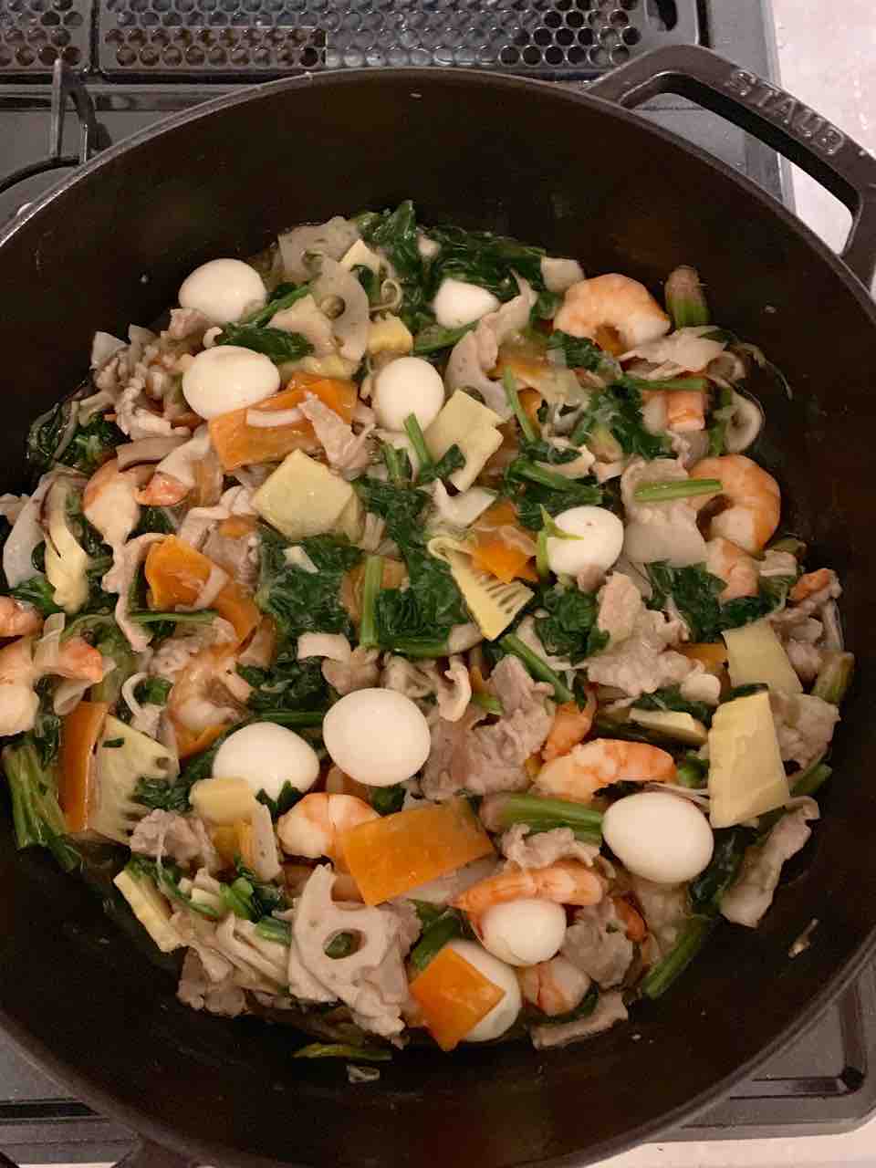 その筍と、ほうれん草、にんじん、れんこん、長ねぎ、しいたけ、うずらの卵、豚ばら肉、海老 で八宝菜を作りました。
