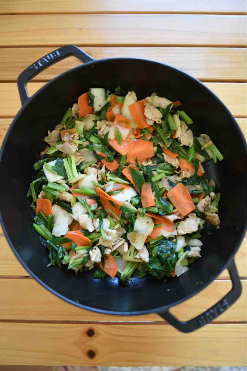 豚肉、にんじん、かぶ葉、かぶの皮、葉ねぎ で肉野菜炒めも作りました。