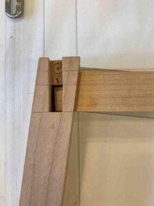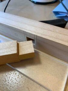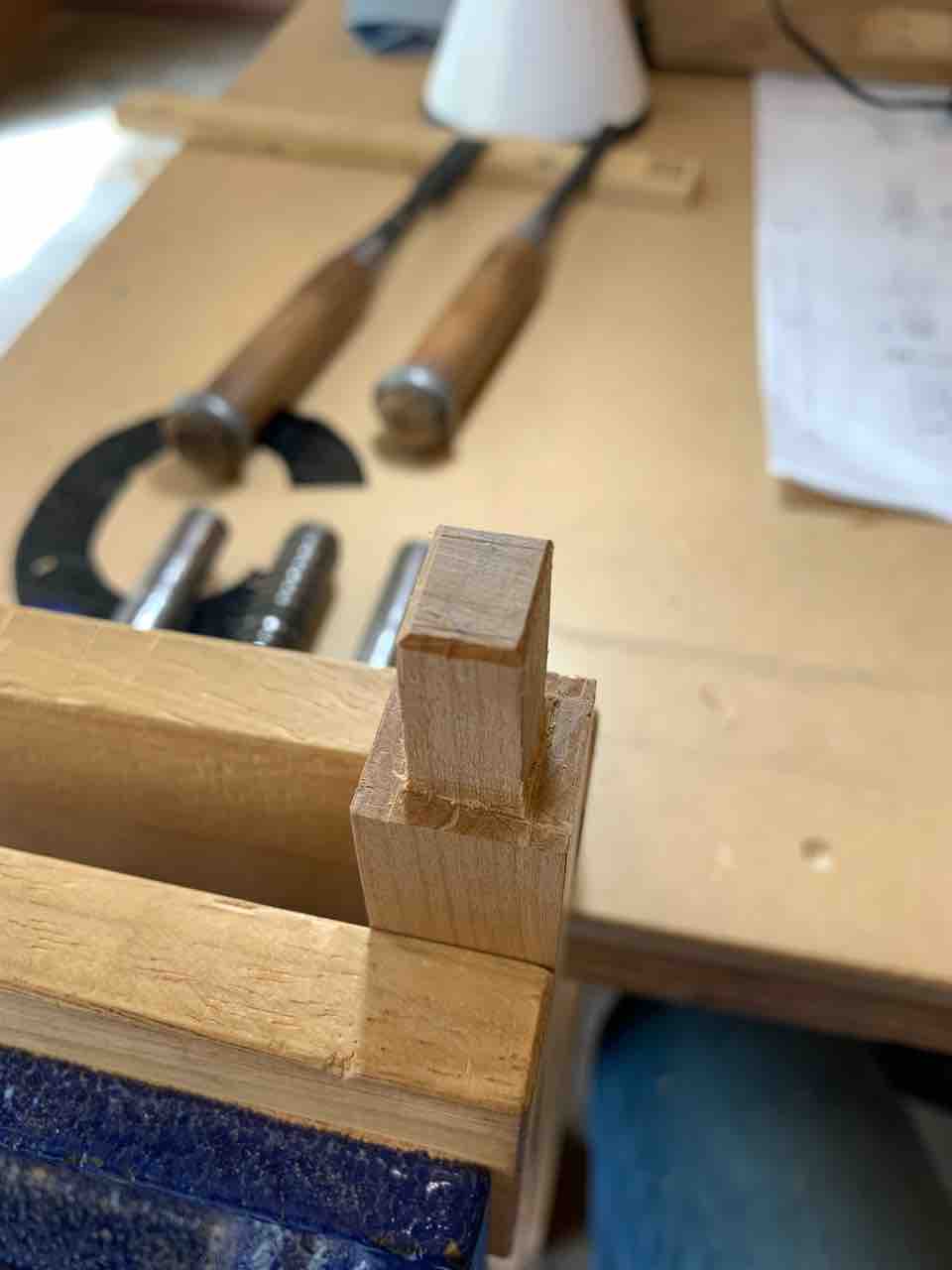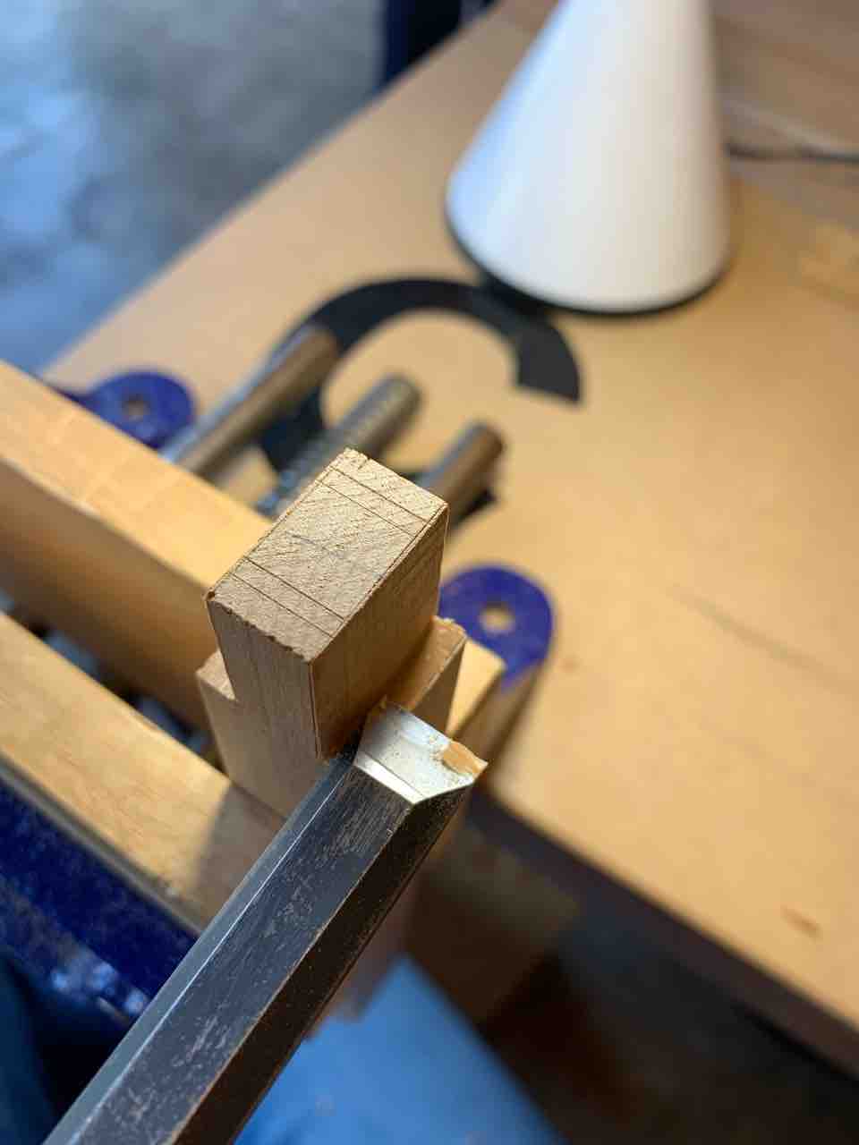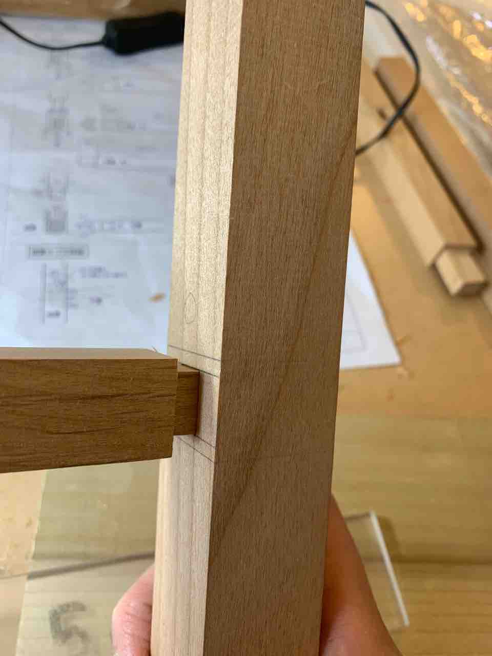 椅子作り その14 側貫の四方胴付 2019 5/27 木工教室 2019年5月27日 毎回楽しみにしている木工教室です。 側貫(がわぬき、脚の真ん中くらいに付ける補強のための横木)のホゾ加工をしました。 ホゾの形は「四方胴付」と言って、断面の外周を彫って中心部だけ飛び出した形状のホゾです。 四方胴付を作る時、まず二方胴付を作ります。 二方胴付からの四方胴付です。 ダキ(長手方向のはめ合い)、キキ(長手方向と垂直方向のはめ合い)、両方向を確認しました。 最終的なはめ合いを調整しました。これを4か所全てやりました。何時間もかかりました。 脚の加工も終わりが見えてきました。 励みになります。 応援のクリックお願いします<(_ _)> 木工教室 この記事が気に入ったら フォローしてね! Follow @citrus_bkr よかったらシェアしてね! URLをコピーしました! URLをコピーしました! 椅子作り その13 側貫(がわぬき)の加工 椅子作り その15 側貫のホゾの調整 この記事を書いた人 kitchen_obake 関連記事 【木工教室 最終回】白書き(しらがき)と毛引き(けひき)の仕込み 2021年8月30日 小抽き出し その27 塗装(2回目), 持ち手の取付け 2021年8月29日 小抽き出し その26 台輪の取付け、塗装(1回目) 2021年8月26日 小抽き出し その25 抽き出しのはめ合い調整 2021年8月19日 小抽き出し その24 天板の取付けと台輪 2021年7月23日 小抽き出し その23 背板の接ぎ合わせ 2021年6月24日 小抽き出し その22 天板の接ぎ合わせ 2021年6月11日 小抽き出し その21 摺り桟の取り付け 2021年6月10日 コメント コメントする コメントをキャンセルコメント ※ 名前 ※ メール ※ サイト 次回のコメントで使用するためブラウザーに自分の名前、メールアドレス、サイトを保存する。