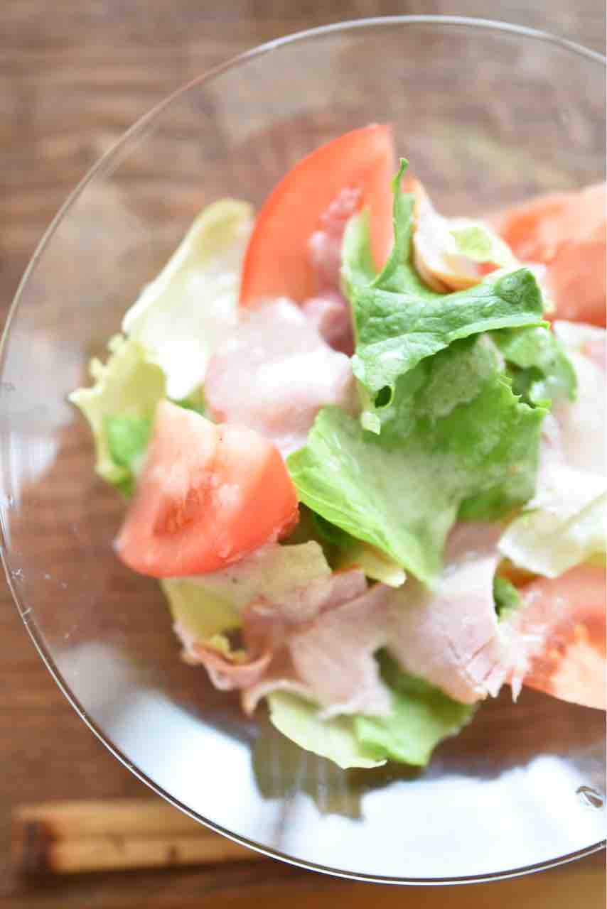 リーフレタス、トマト、ハム でサラダも作りました。函館カール・レイモンのブロックハムを紙のように薄く切りつけるのにハマっています。シンプルなのにすごくおいしいサラダになるんです。