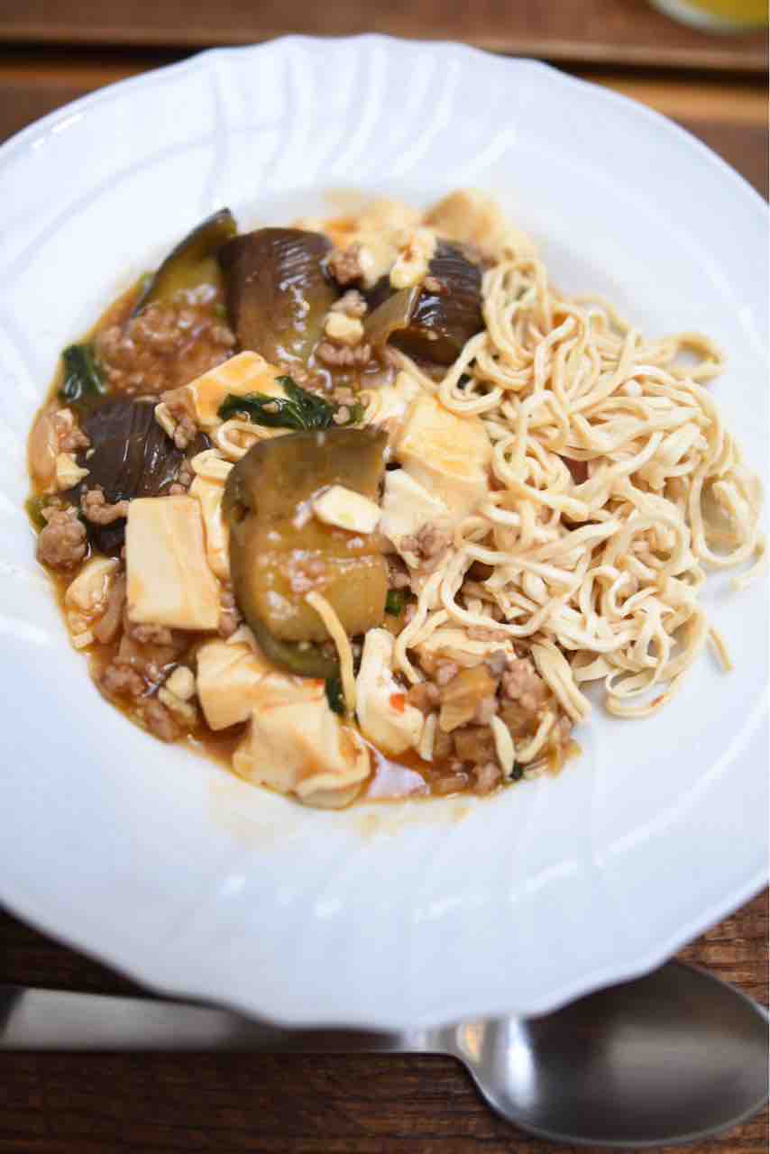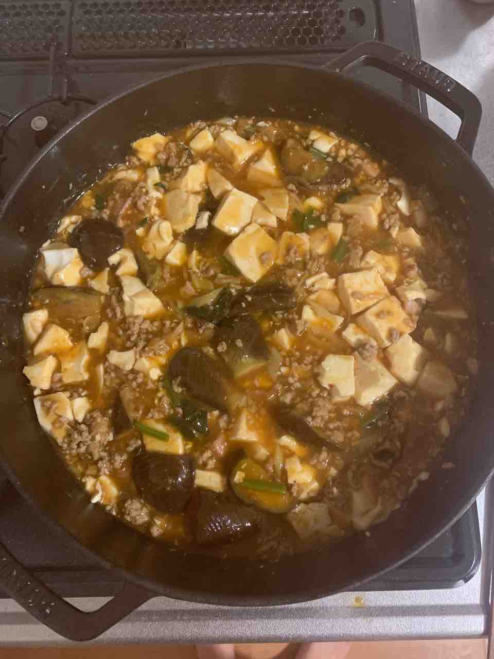 豚ひき肉、長ねぎ、なす、豆腐 で麻婆豆腐を作りました。これは息子が炒めてくれました。