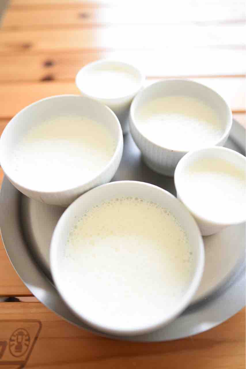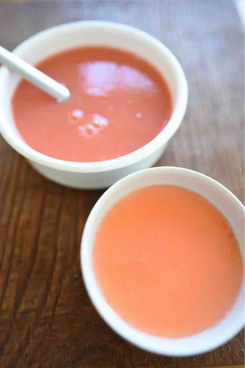 こういう流しものを作る時は、ゼラチン5g(小さじ1杯強)に対して、水分を370gくらいにすると決めています。自分好みのホワホワ、ふるふる食感に決まります。