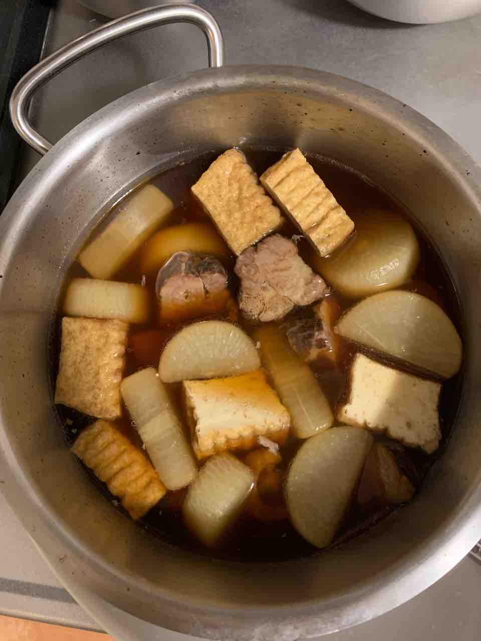 大根、厚揚げ、豚ロースブロック で炊き合わせも作りました。大根は水煮しておき、豚ロースブロックは電気IH圧力なべで醬肉(ジャンロウ)にしてから、12杯の煮汁を作って合わせました。