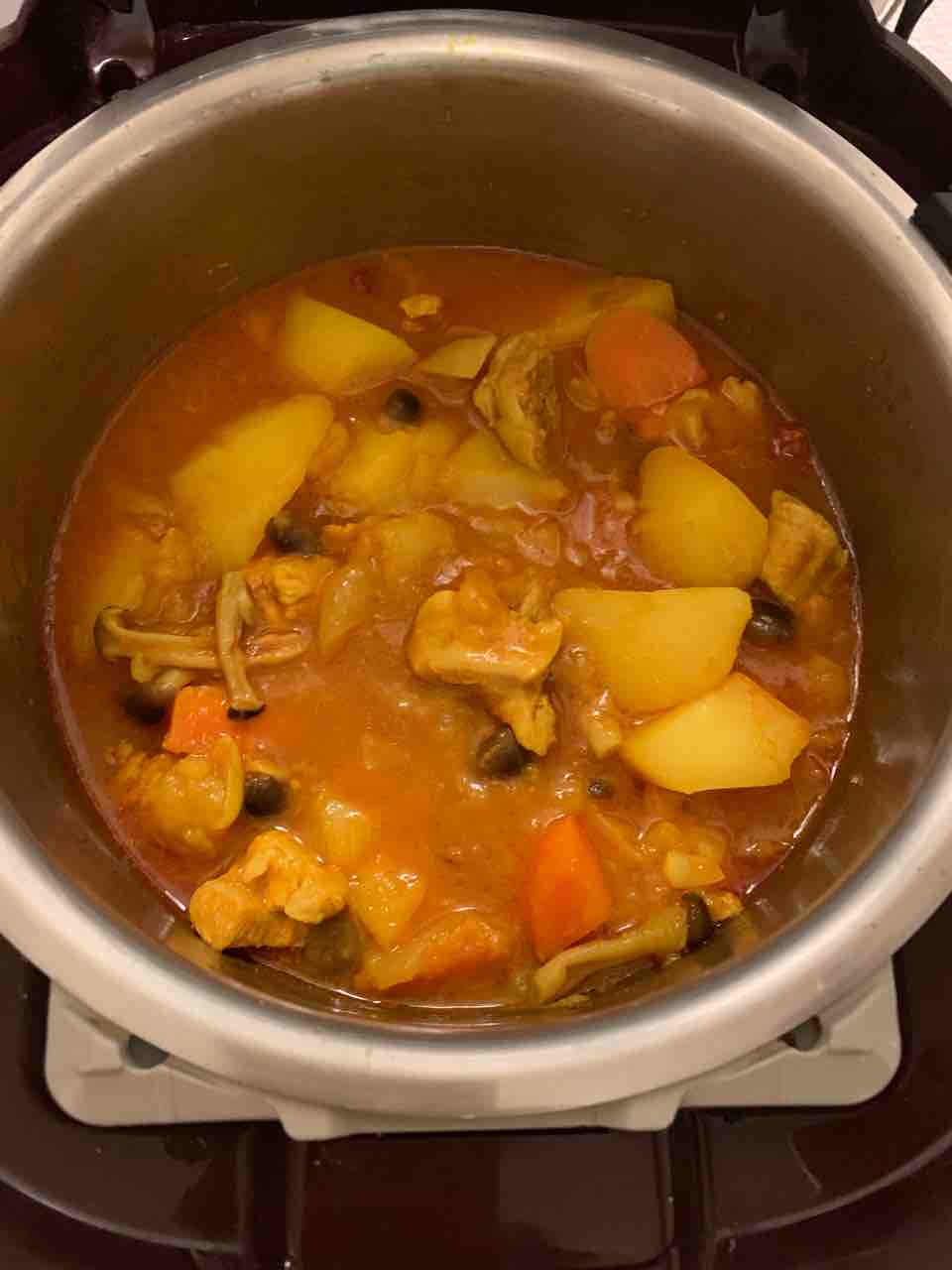鶏もも肉、たまねぎ、にんじん、じゃがいも、ぶなしめじ、有機トマトピューレ でチキンカレーも作りました。電気IH圧力なべ で自動調理しました。