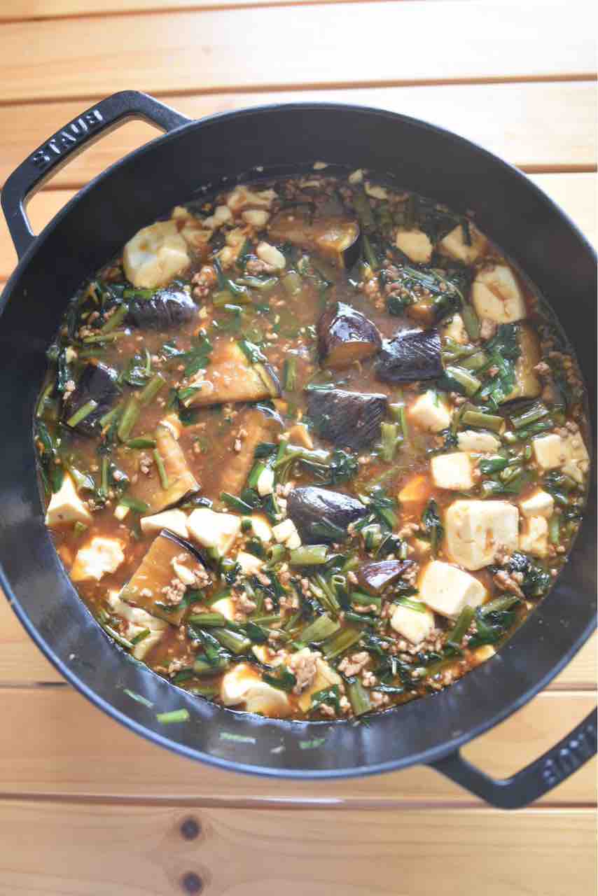 豚ひき肉、木綿豆腐、なす、えん菜、ニラ、生姜、にんにく で麻婆豆腐を作りました。