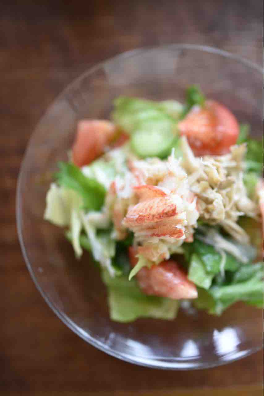 レタス、きゅうり、大葉、トマト、ごぼう和え でぜいたくすぎる毛蟹のサラダを作りました。