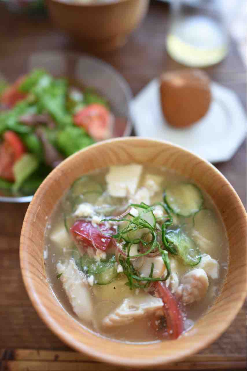 焼魚、豆腐、各種野菜 をふんだんに入れてキンキンに冷たくして食べるので、猛暑でもびっくりするほど食欲が湧いておいしく食べられる料理です。