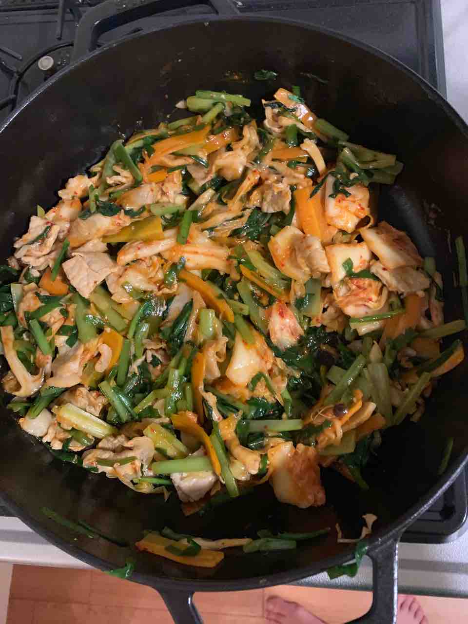 豚肉、小松菜、ニラ、にんじん、しめじ でキムチ炒めも作りました。