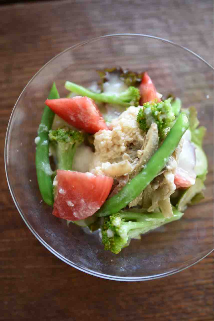 このごぼうサラダ、サニーレタス、ブロッコリー、いんげん、トマト、叩き長芋、蛸 でサラダを作りました。