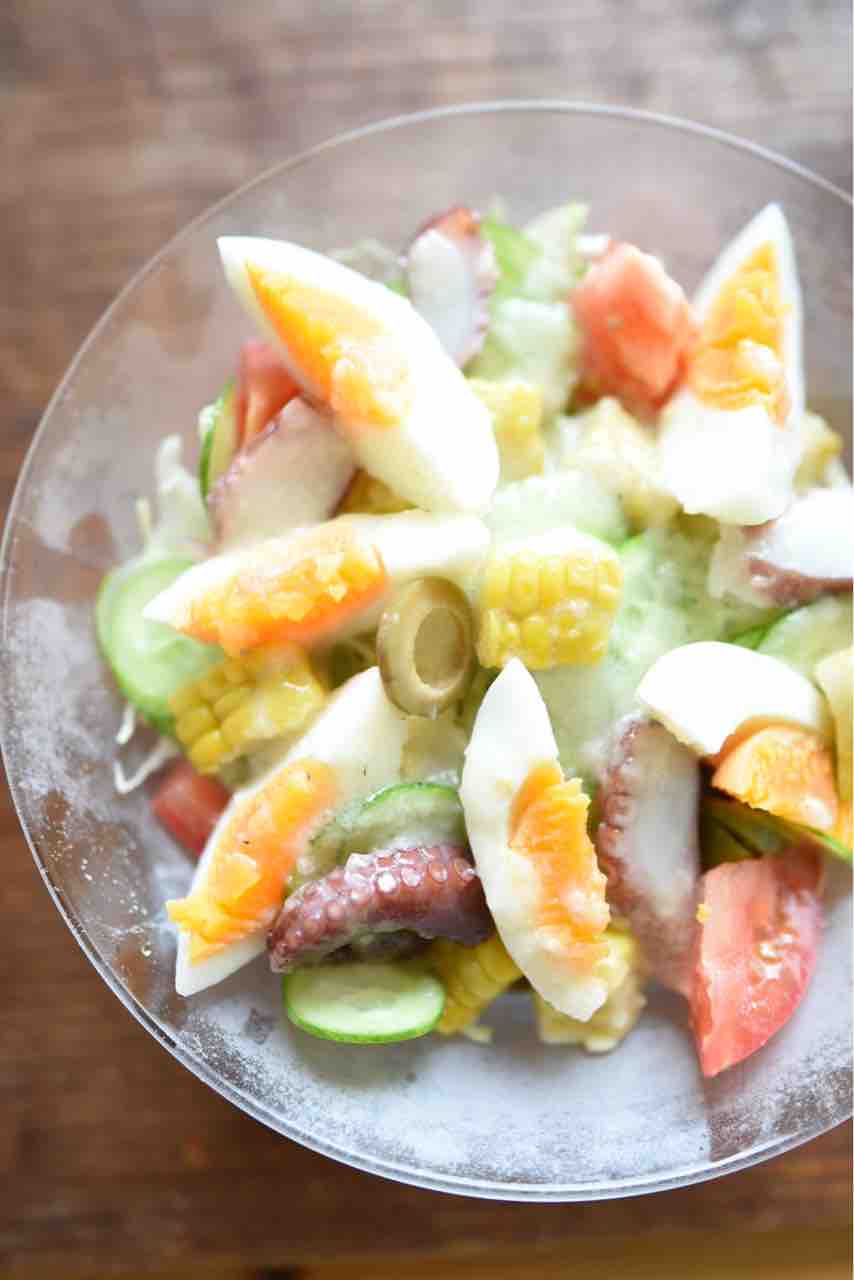 またある日は、千切りキャベツ、きゅうり、とうもろこし、オリーブ、トマト、蛸、ゆで卵 でサラダにしました。
