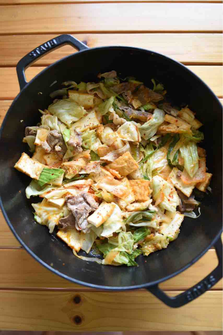 豚肉、厚揚げ、キャベツ、葉ねぎ、玉ねぎ でキムチ炒めも作りました。マイクロプレインのマルチスパイスミルで山椒をふりかけました。