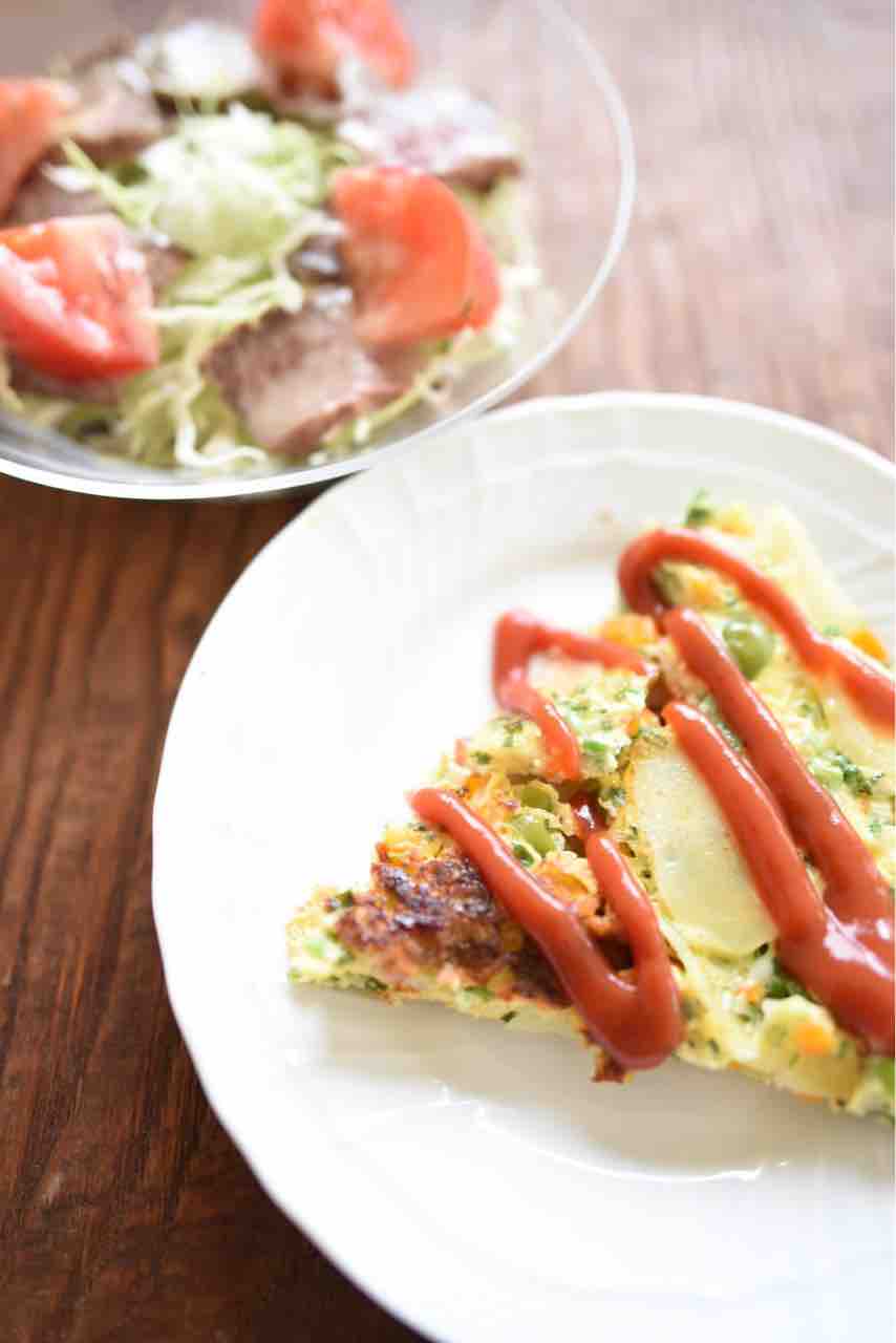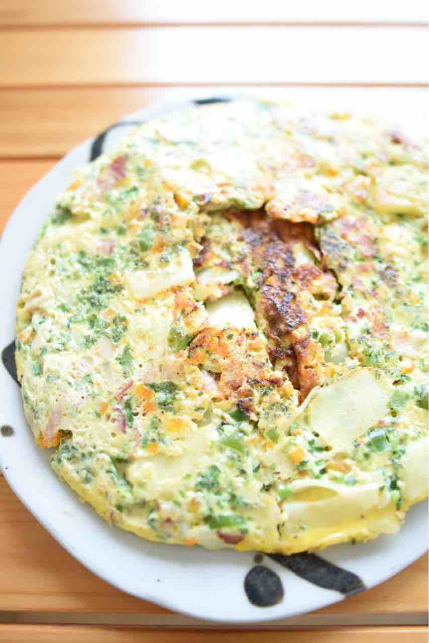 卵、ベーコン、じゃがいも、玉ねぎ、にんじん、ピーマン、葉ねぎ でスペイン風オムレツ も作りました。ちょっと真ん中破れてしまいましたけれども。