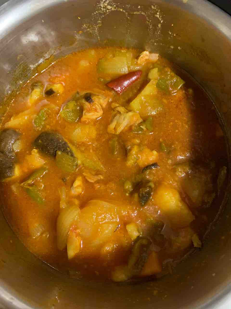 玉ねぎ、にんじん、じゃがいも、ピーマン、なす、鶏もも肉、有機トマトピューレ でチキンカレーも作りました。こちらも、息子がほとんど全部やってくれました。