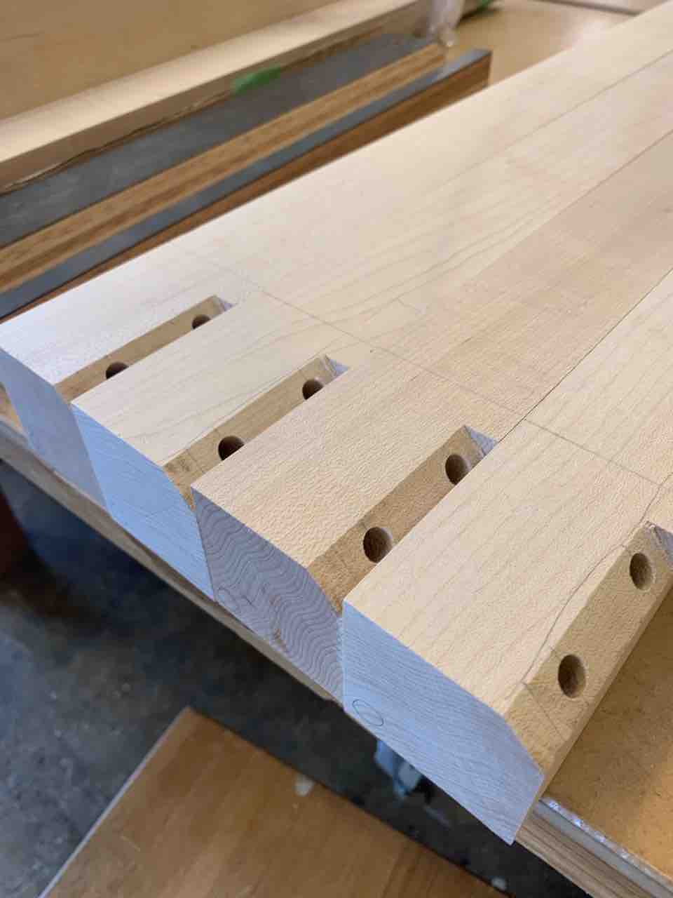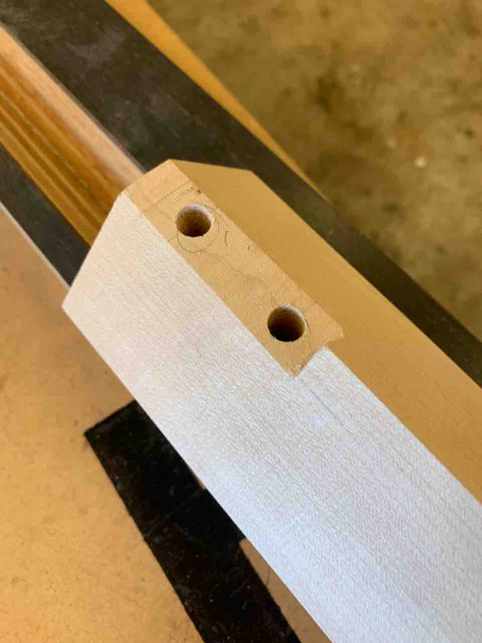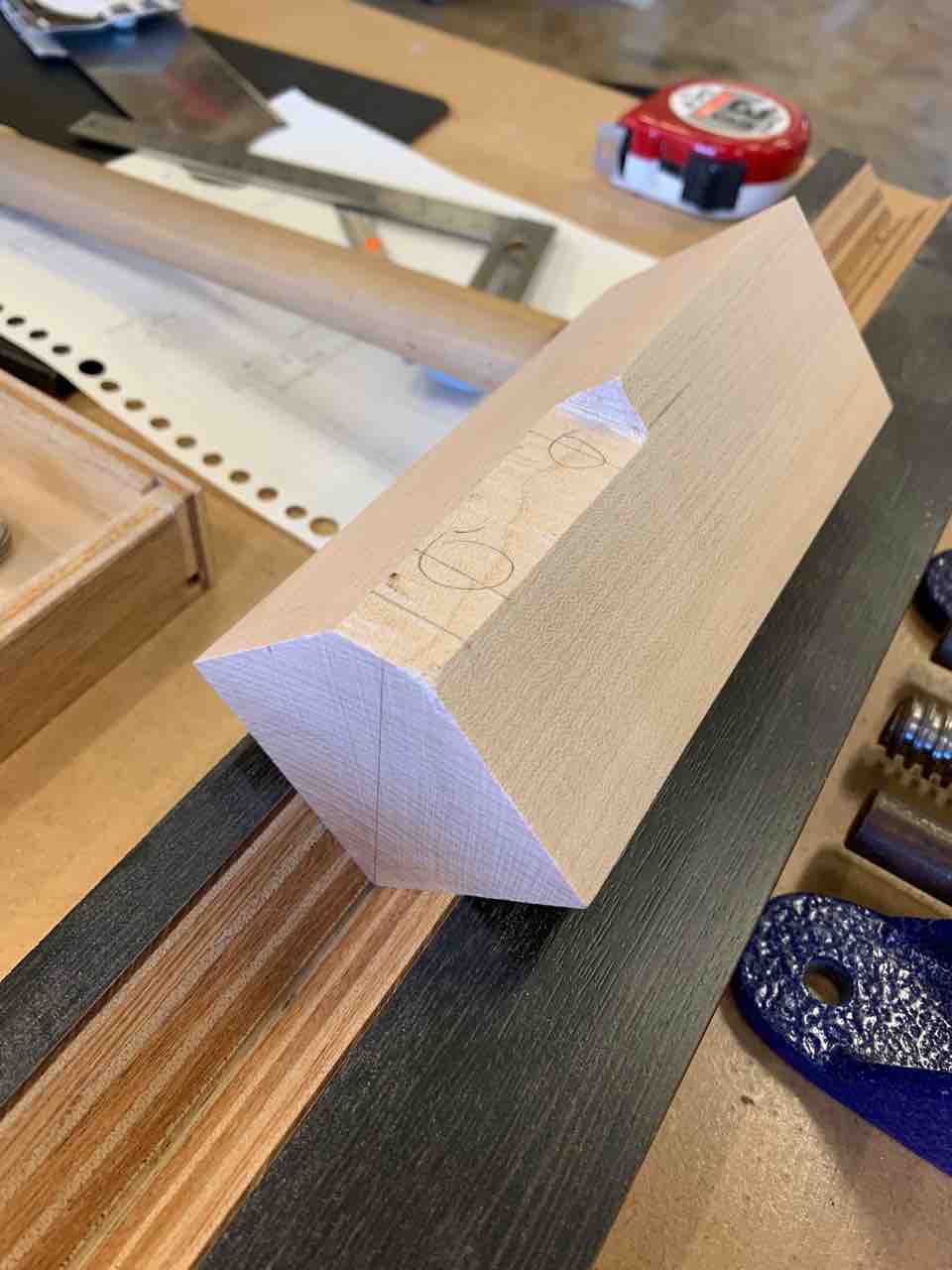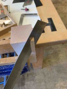 まず、脚の上端を鋸で45度にかきとりました。メープル材は堅いので、たった60mmの鋸挽きなのに、ゼットソー(高速挽きできる鋸)を使っても四苦八苦しました。