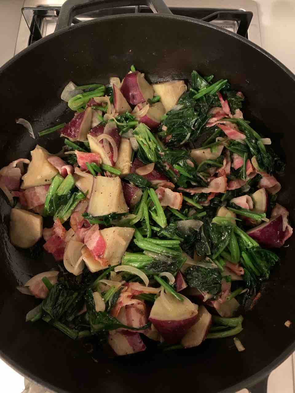 ベーコン、ほうれん草、さつまいも、ズッキーニ でバター炒めも作りました。