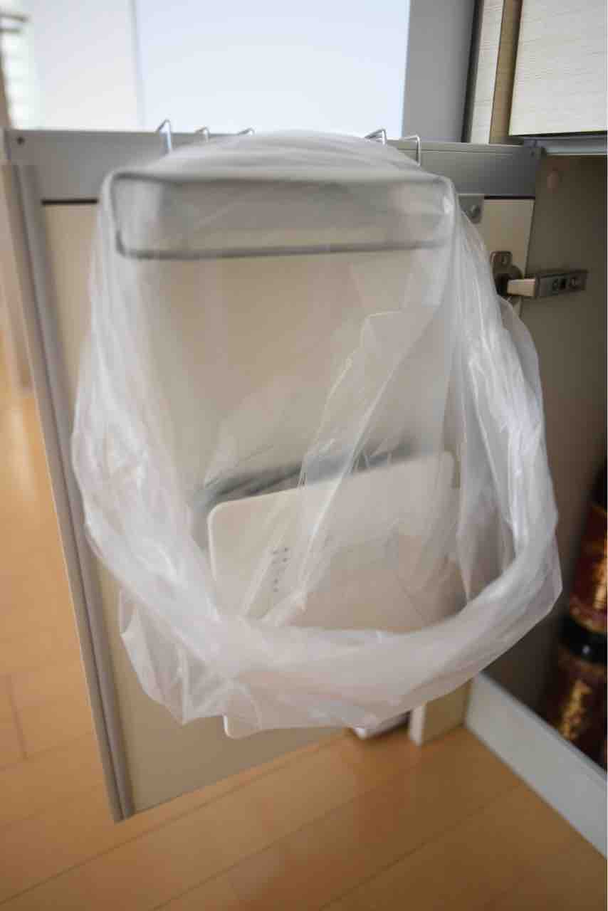 左扉には、燃やすゴミを入れる袋を掛けています。金具はKEYUCAで買いました。